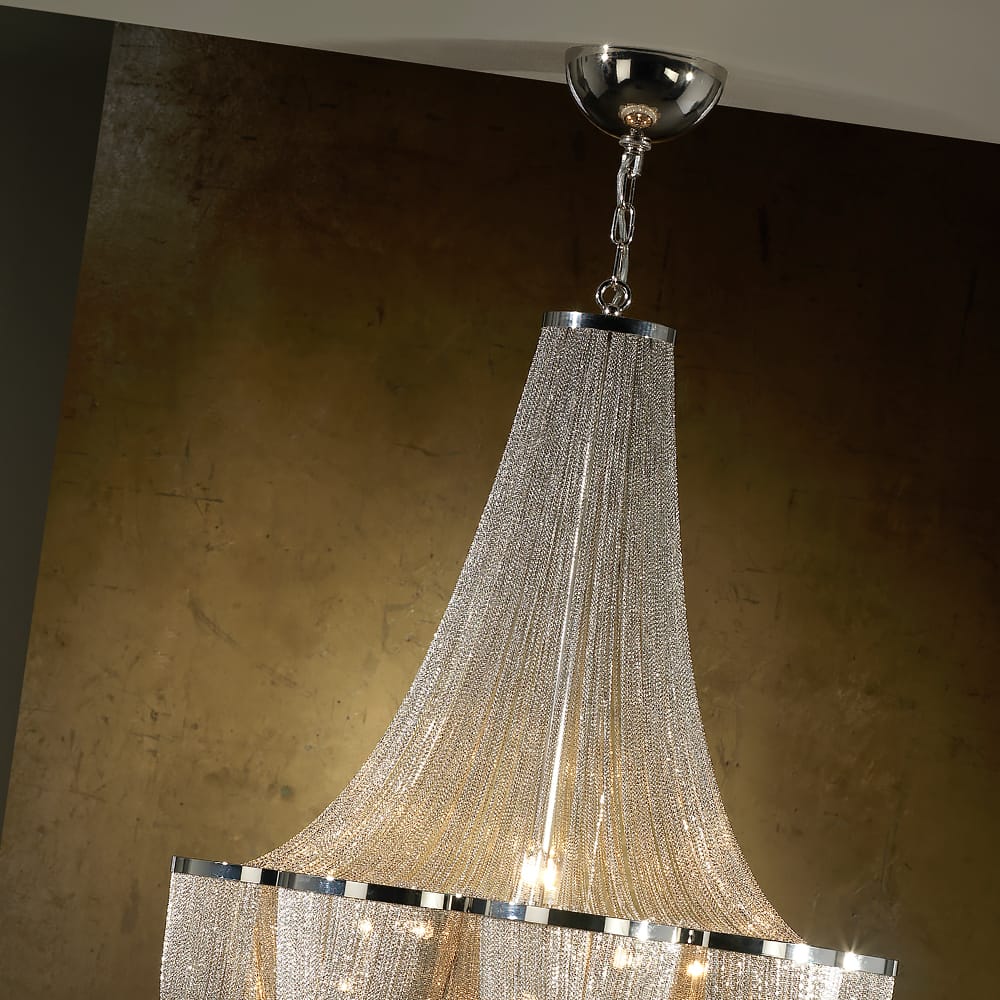 Featuring seductive gathered veils of fine metal chains with a chrome and nickel finish creating a sensational focus. Height 110 cm x diameter 68 cm. Heights when installed minimum 125 cm, and maximum 200 cm. Includes 12 x G9 LED 6W bulbs. Weight 12 kg. This chandelier is part of a larger collection of luxury lighting including wall and ceiling lamps and various chandeliers in different sizes.