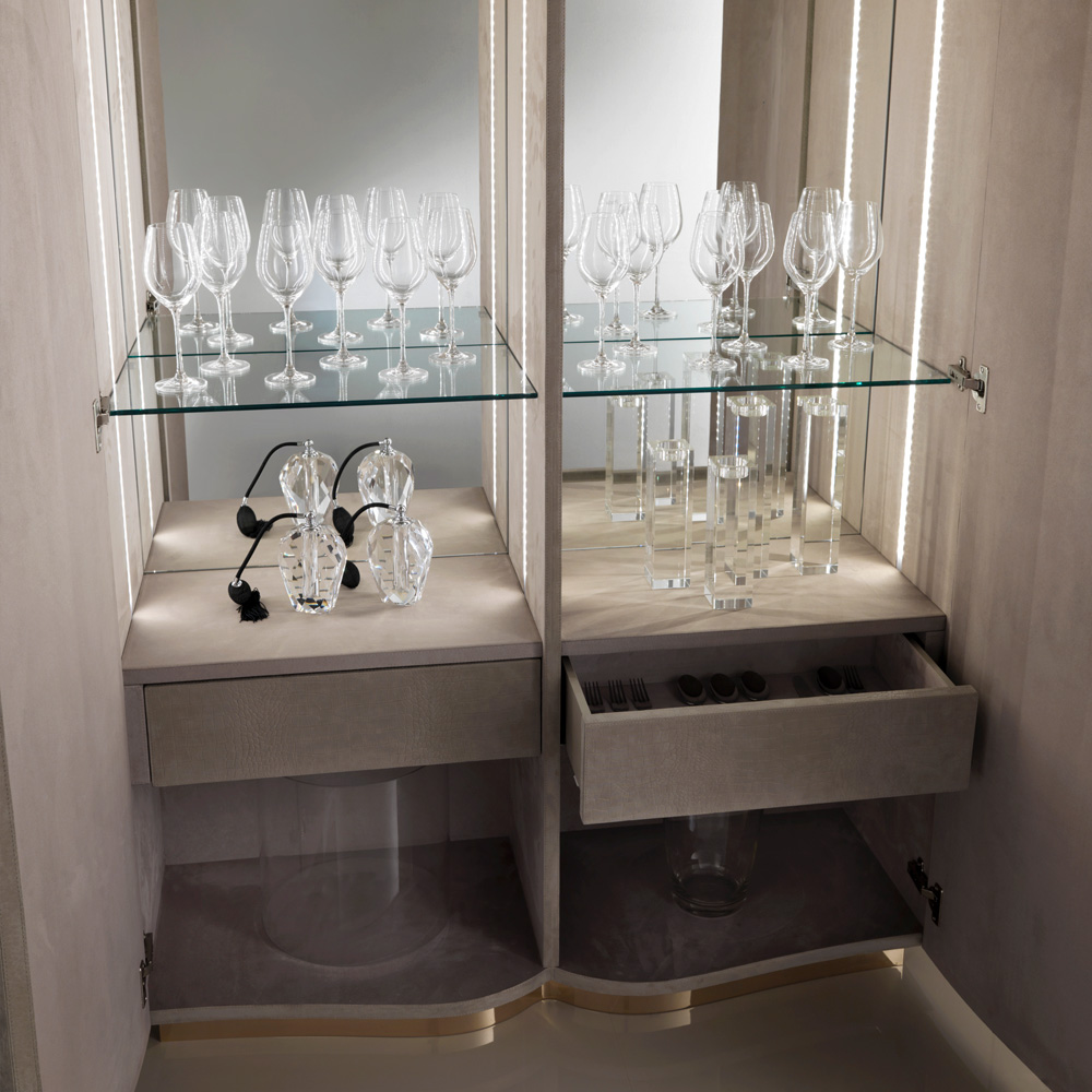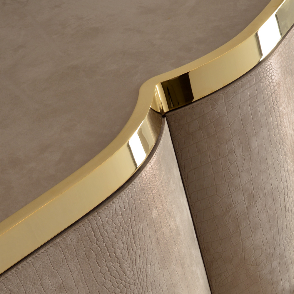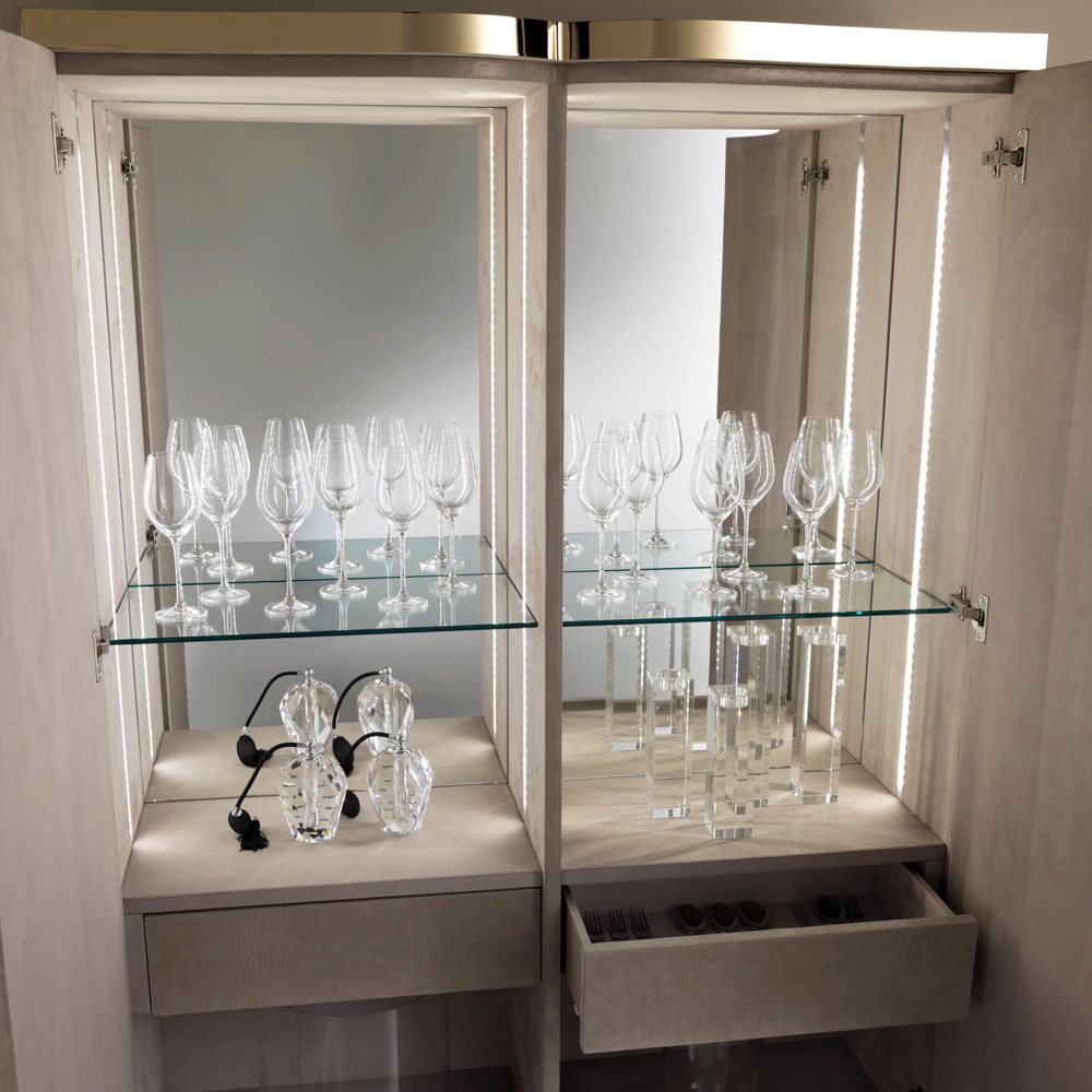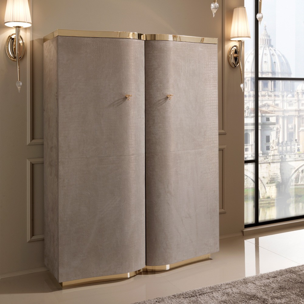 As comfortable in a dining room, living room or study as it is as a welcome in an entrance hallway. Shown here with a luxurious high quality glitter alligator embossed nubuck leather finish to the frame and doors, completed with statement laser perforated gold handles. All nestled on a 24 Carat Gold plated plinth base with coordinating top detailing – enhancing the cabinets curves, following its exquisite lines. Height 170 cm x width 124 cm x depth 48 cm. Bespoke sizes, various handles and finishes available such as the option to order in any RAL classic high gloss or matt colour, natural or bronze bevelled mirrored glass, various leathers including suede, traditional and nubuck, and gold, silver or champagne leaf to the frame or doors. A polished stainless steel plinth also an option. Prices will vary.