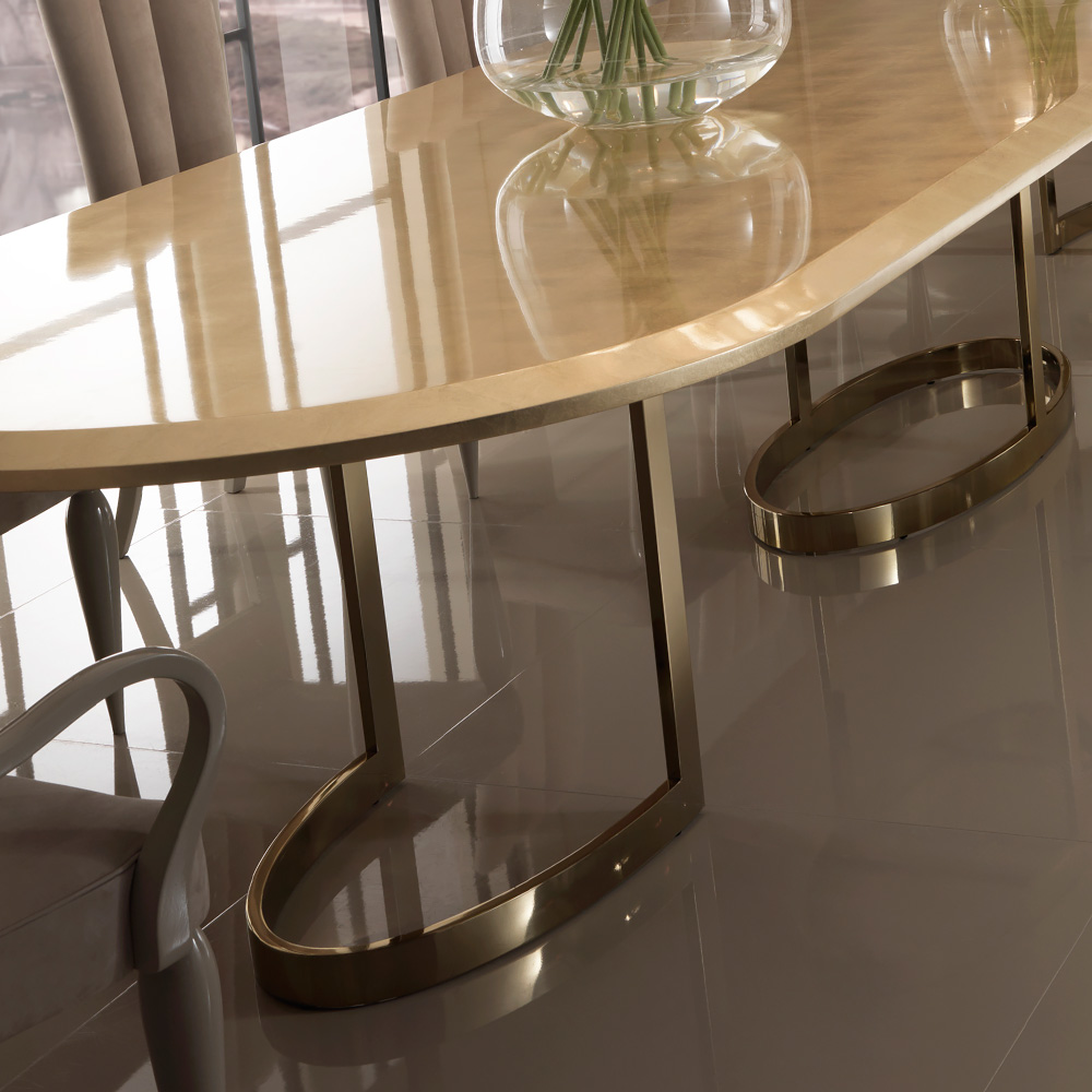The table is available as standard in the smaller sizes of 240 cm and 280 cm wide, to order in bespoke sizes and with different leg designs in stainless steel or antique bronze. The table top and chair are also available to order in any RAL high gloss or matt finish, and in silver, gold or champagne leaf and in various chair fabrics including customers own, and other leathers including traditional, suede and alligator embossed pattern. Prices will vary.