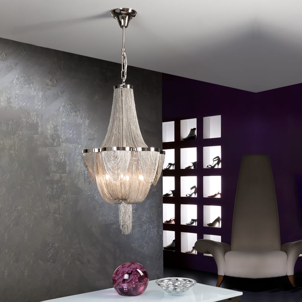 The 6 Light Silver Chain Empire Style Chandelier, a beautiful chandelier is much more than just a light. This glamorous design offers timeless elegance and a sophisticated ambience.