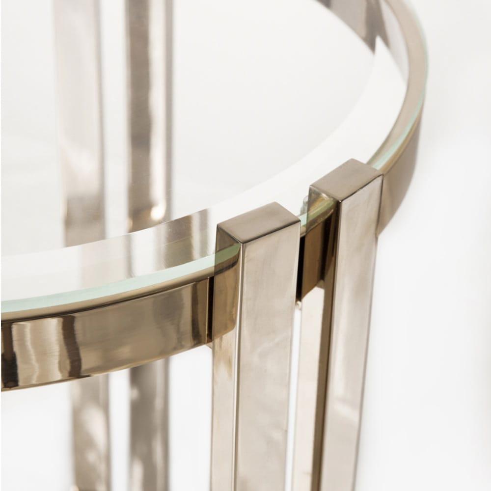 The perfect union of materials, a harmony of forms. Remarkable slim brass structures with distinctive Art Deco styling in a fabulous polished 24 carat gold finish, completed by beautifully bevelled clear round glass tops. Creating a truly fabulous focus. Height 42 cm x diameter 92 cm, and height 36 cm x diameter 62 cm. Various other finishes such as a matt, polished and brushed gold, brass, nickel, black nickel and copper and matt or high gloss RAL lacquer colours are also available by request. Prices will vary.