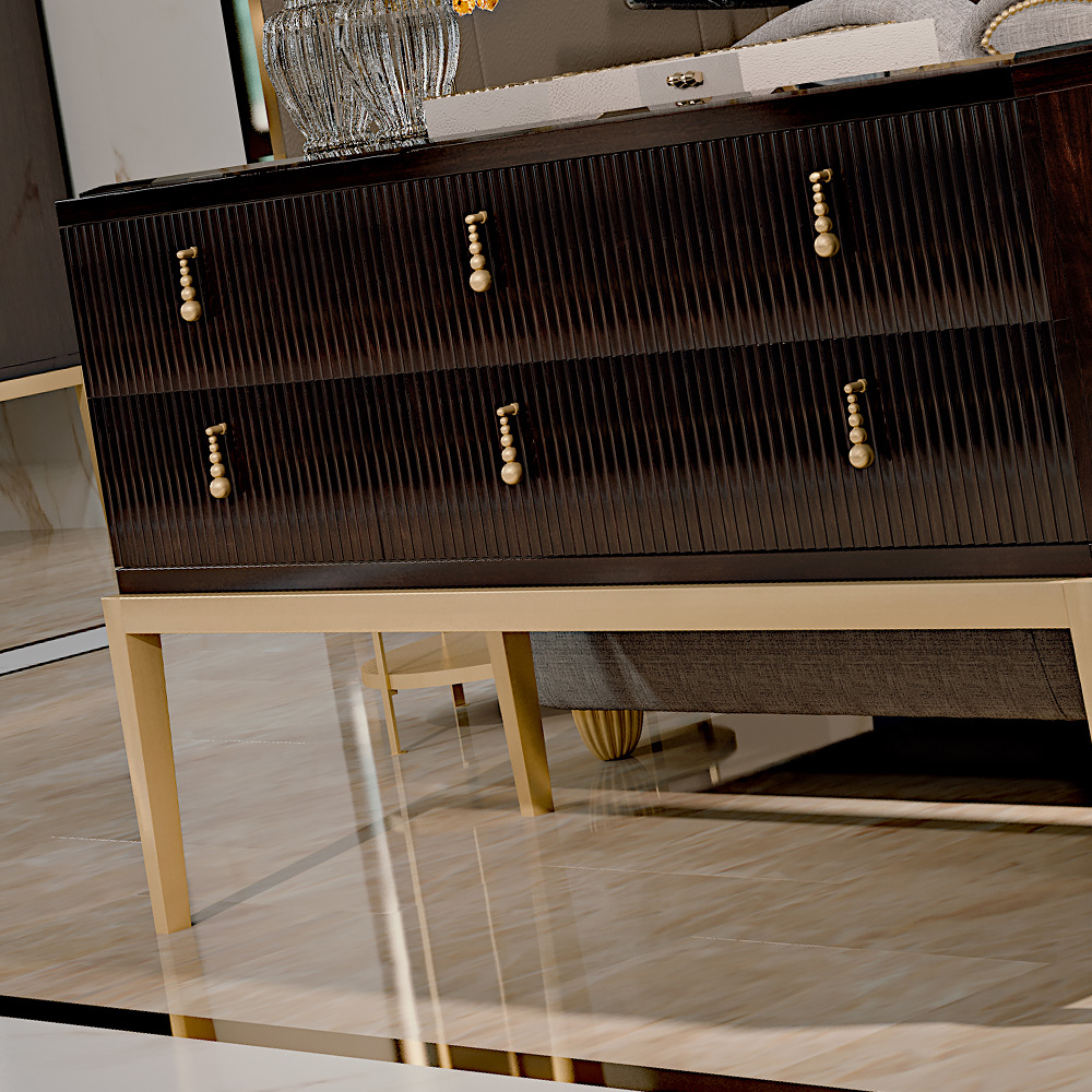 A dark ebony high gloss lacquered structure features stunning deco style ribbed draws, complimented by delicate statement droplet handles in an antique gold finish and a perfectly contrasting wooden frame with a gold leaf finish. Completed with an optional beautifully polished dark Emperador marble lavish top insert. Height 88 cm x width 183 x depth 56 cm. Also offered in a 4 drawer version as standard, width 123 cm.