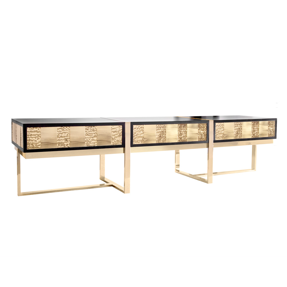 The perfect union of materials, a harmony of forms with statement Art Deco styling. Elegant feature continuous legs, formed in brass and shown here in a polished 24 carat gold finish. Supporting the most beautiful statement high gloss lacquered body boasting 3 soft close push pull mechanism drawers. This unique bespoke decorative piece combines two different finishes, brushed and hammered geometrical squared shapes which have been applied by hand in the gold plated brass. Creating a truly fabulous focus. Weight 84 kg. Various other finishes such as a matt, polished and brushed gold, brass, nickel, black nickel and copper and matt or high gloss RAL lacquer colours also available by request. Prices may vary.