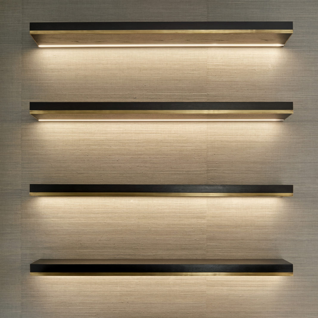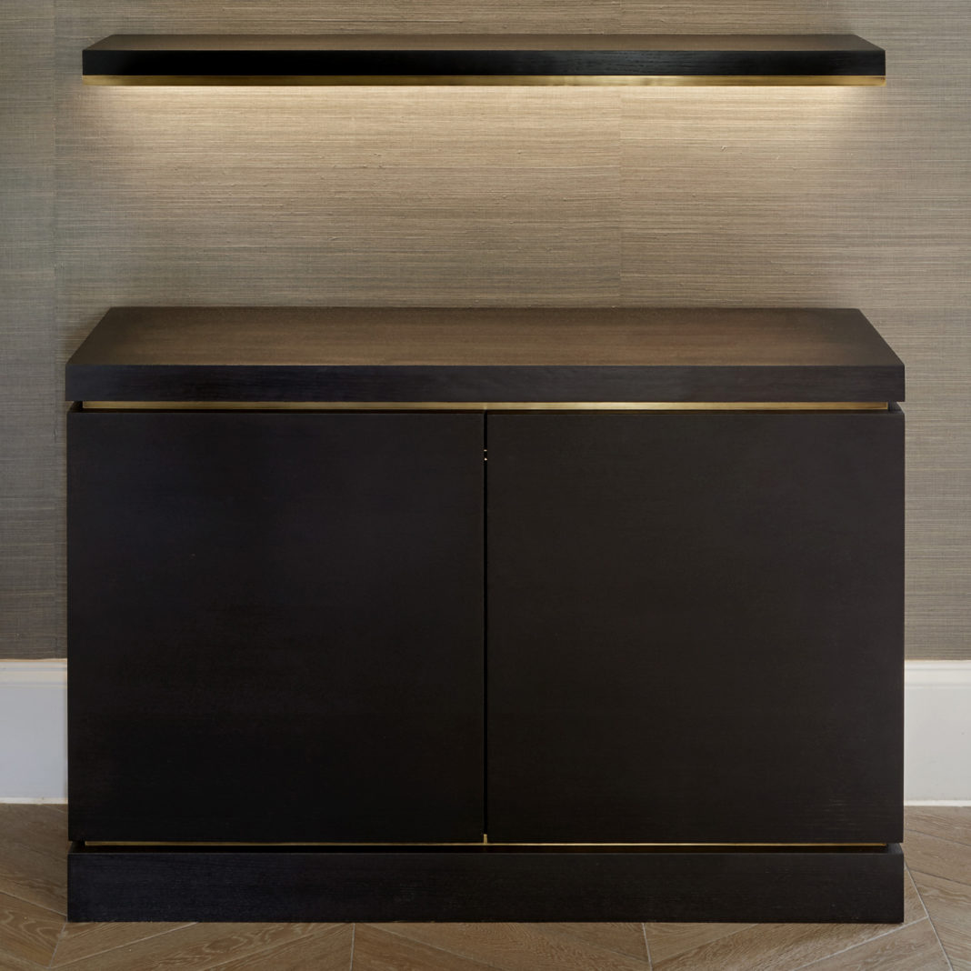 Superbly executed by master craftsmen this fabulous set is outstanding in its use of luxury elegant materials and attention to detail. A harmony of forms. A fabulous contrasting combination of oak veneer and brushed brass detailing, with back lighting for a floating effect. Cabinet with internal shelf – height 80 cm x width 120 cm x depth 33 cm. Floating shelves x 4 – width 120 cm x depth 23.5 cm. Overall height can be altered at installation stage. Electrical connection not included. Alternative colours, finishes and special sizes are also available by request. Prices will vary.