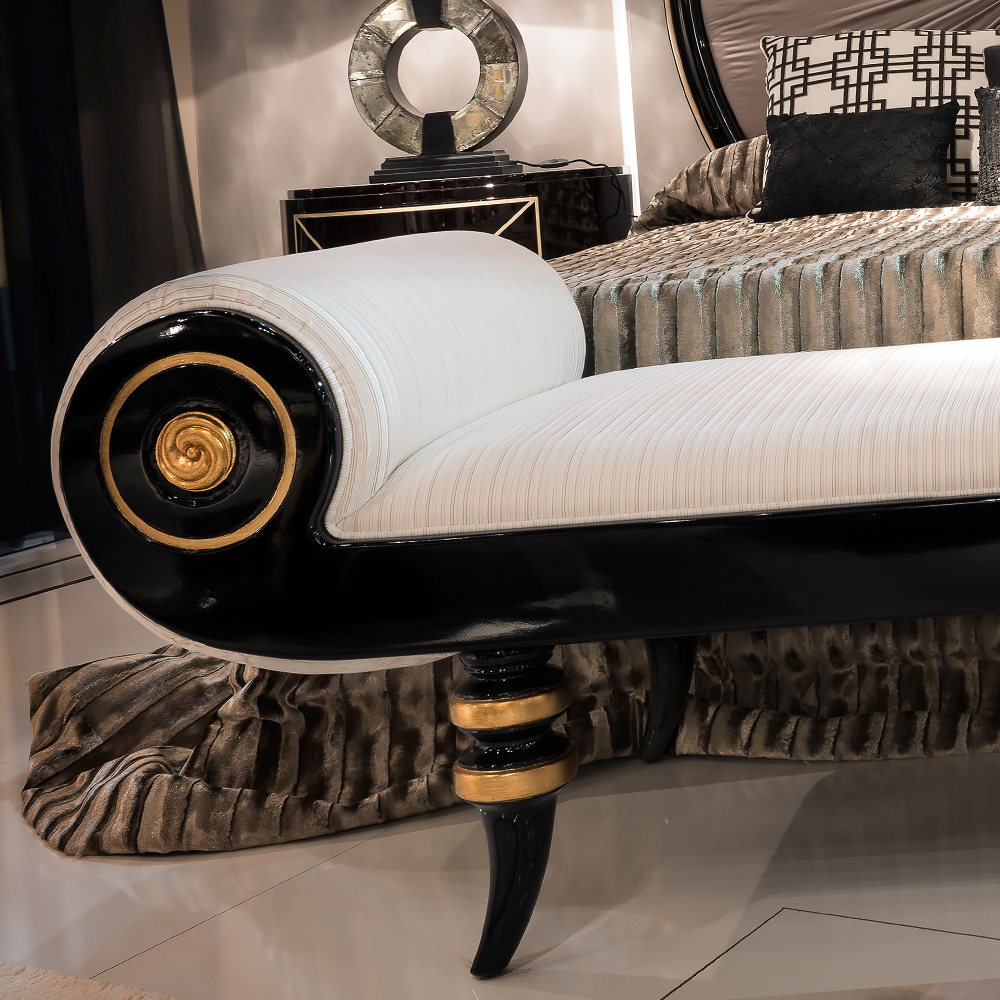 The neoclassical style provides timeless elegance, equally at home in a modern or classic setting, use as a bench or a chaise longue. Offering an impressive focus to a bedroom, sitting room or entrance, with greek/roman inspired decorative design elements and superb upholstery. Made of solid wood finished with a high gloss black lacquer along with gold leaf details, and upholstered and padded to the highest standards using customers own choice of luxury fabric.