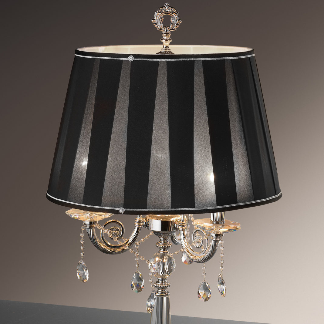 A beautifully detailed ornate brass structure in a shiny chrome finish, supporting transparent glass detailing and embellished with Swarovski® crystal beads and drops. Completed by a shade in jersey and silk fabrics, with exquisite two-tone trim and motif details. In 2 sizes and styles, as standard. Candelabra style, at height 95 cm x diameter 55 cm, weight 6.4 kg – which requires 3 x max 40W E14 bulbs. And height 46 cm x diameter 25 cm, weight 1.3 kg – which requires 1 x max 40W E14 Bulb. Bulbs are not included. Available with alternative shades, and in various sizes and finishes such as French gold brass, and glass colours by request. Prices will vary.