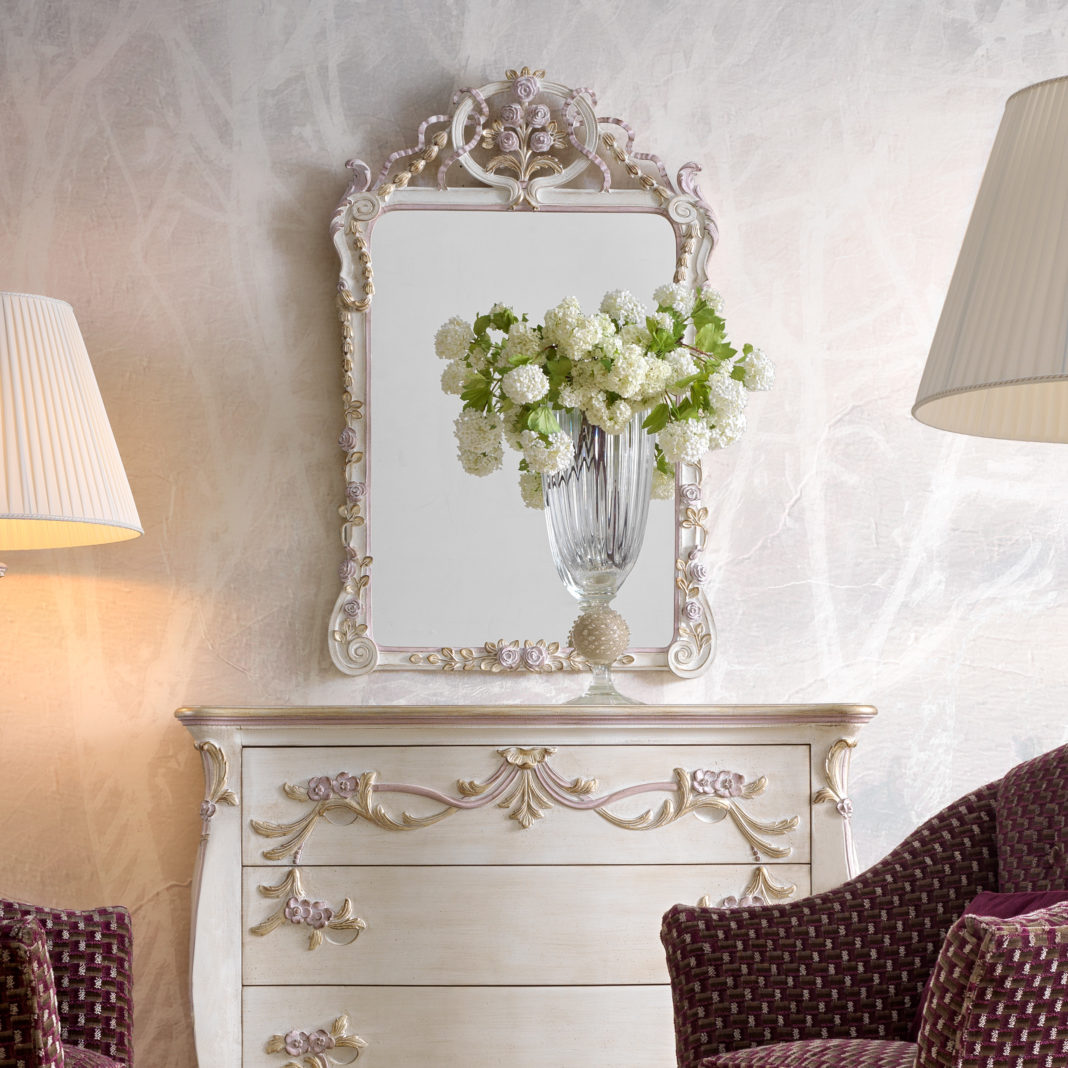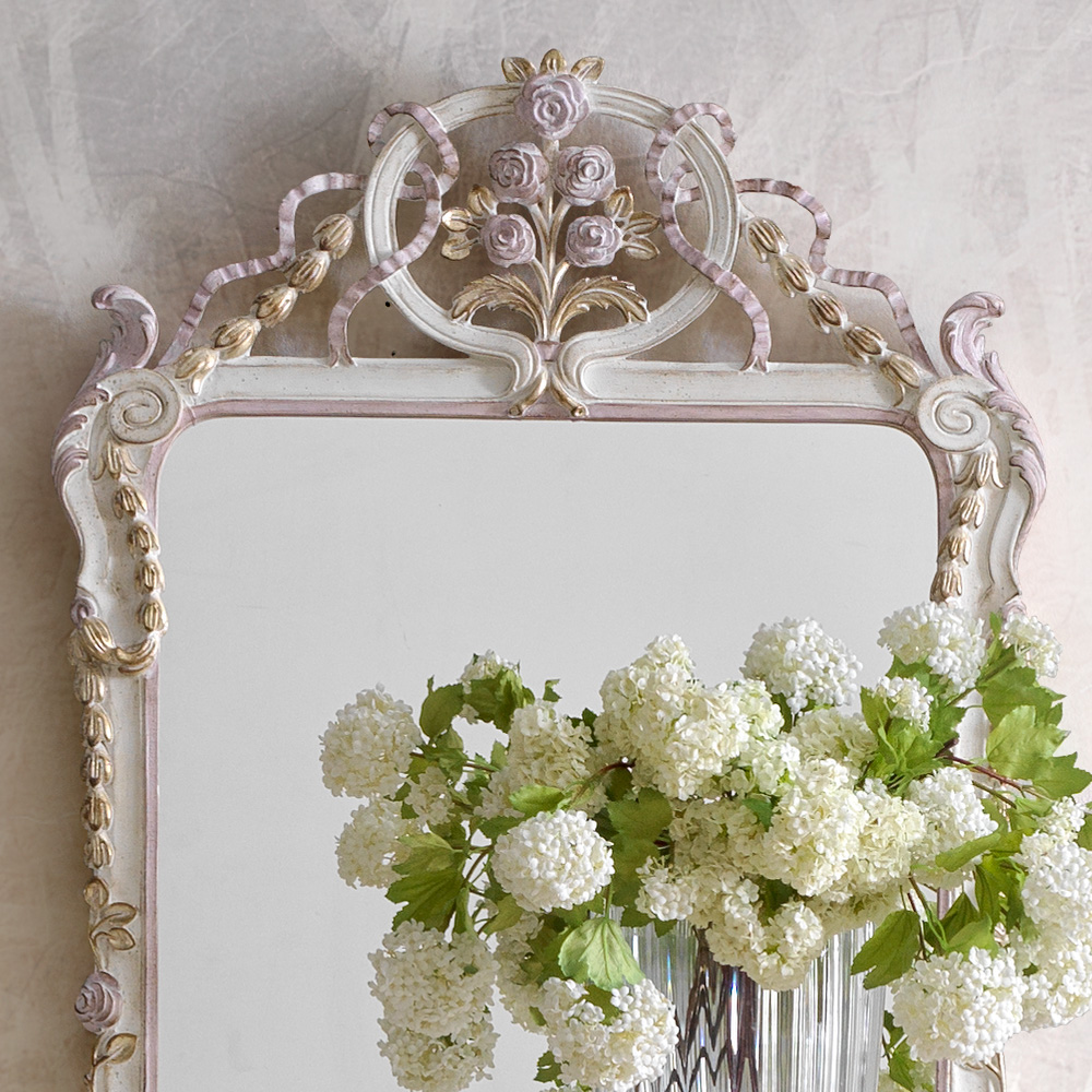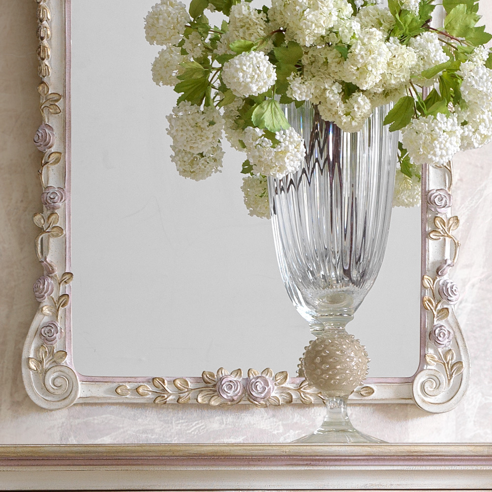 The Carved Floral Italian Wall Mirror, romantic by design and offering classic style for intimate rooms. Truly versatile, with a touch of class. Designed to add perfect grace and form to any interior, true Italian design at its finest. A striking statement piece.