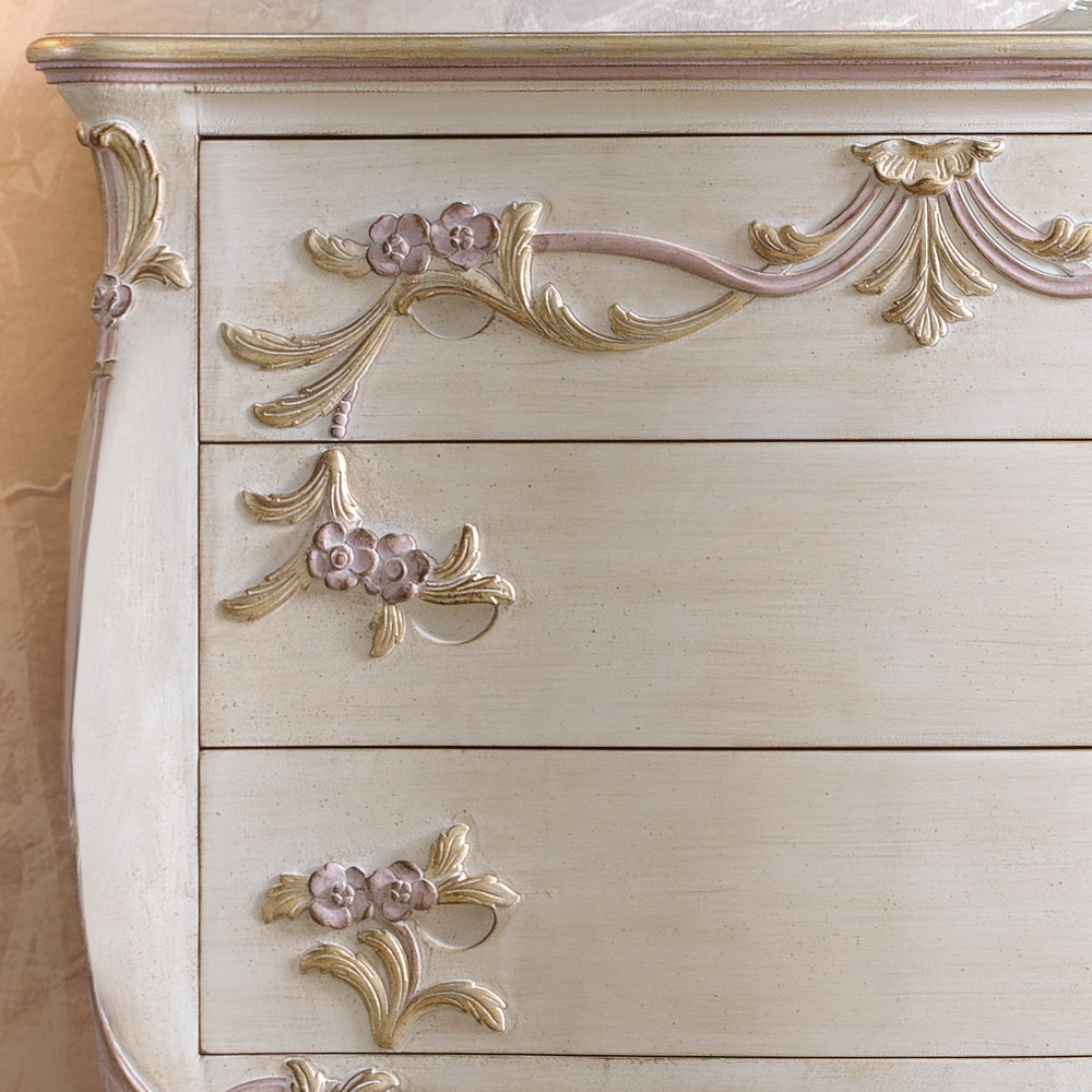 The Carved Italian Chest Of Drawers, romantic by design and offering classic furniture for intimate rooms. A truly versatile storage solution, with a touch of class. Designed to add perfect grace and form to any interior, true Italian design at its finest. A striking statement piece.