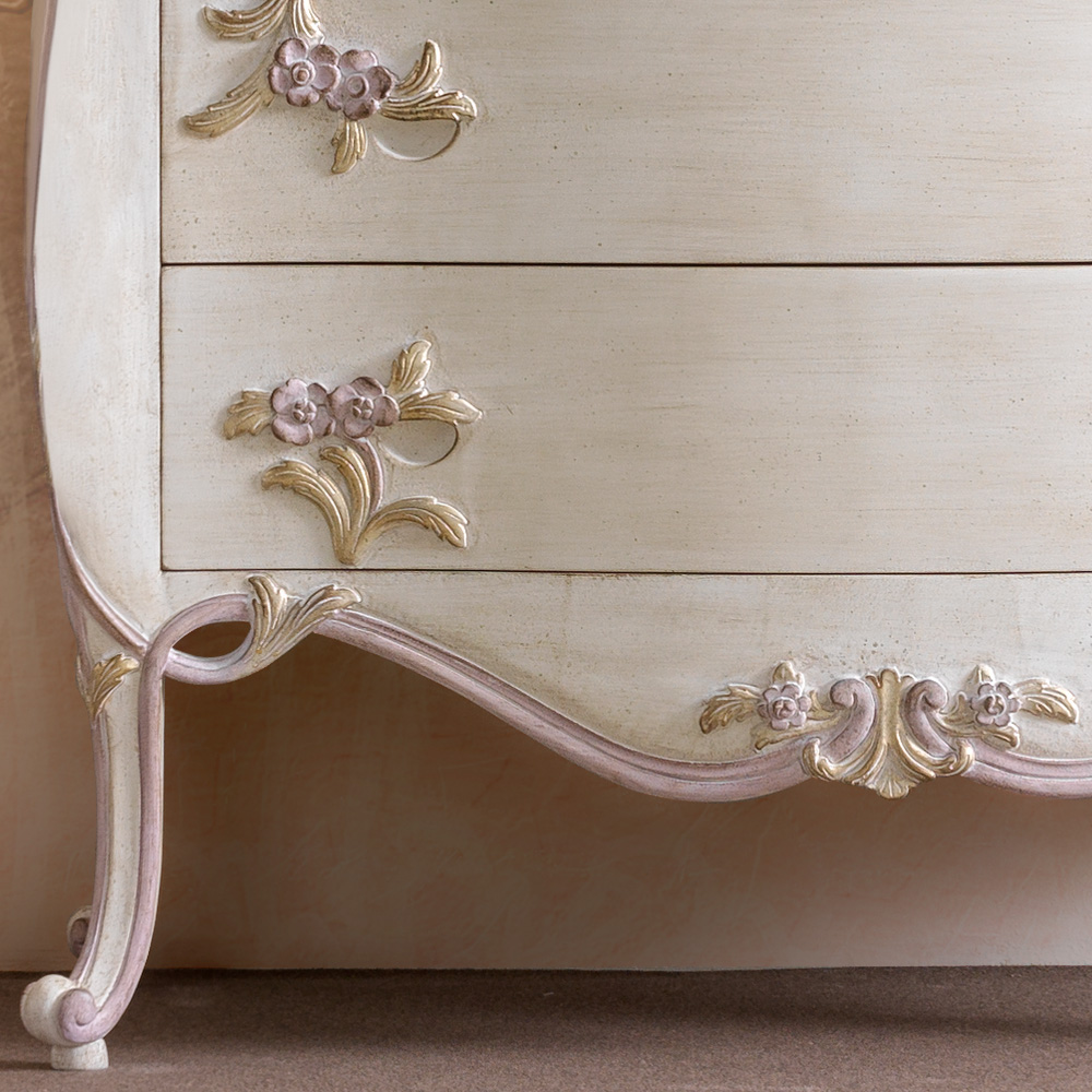 Making curves its defining aspect, and beautifully detailed with flowing botanicals to the front of the three drawers. In a unique Antique white finish together with beautiful antiqued hand painted accents of gold and pale pink, lilac tones. Subtle handle detail and carvings to the sides, flowing through to the feet completes the design. The drawers have an integrated soft close blumotion system for effortless closing and added luxury. Alternative sizes and finishes are also available. Part of a complete bedroom set which includes the beautiful mirror shown here, a bed, matching bedside table, armchair and floor lamp. All of which are available here at Juliettes Interiors.