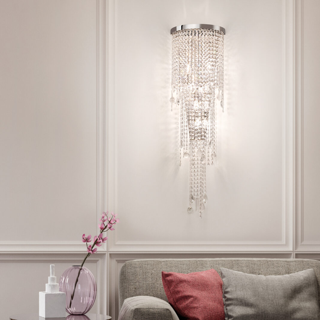 The Chandelier-Style Cut Crystal Wall Light seamlessly combines contemporary elegance with timeless charm. It beautifully captures and reflects light, adding a touch of sophistication. Displayed in pairs, it creates a strikingly symmetrical and luxurious focal point.