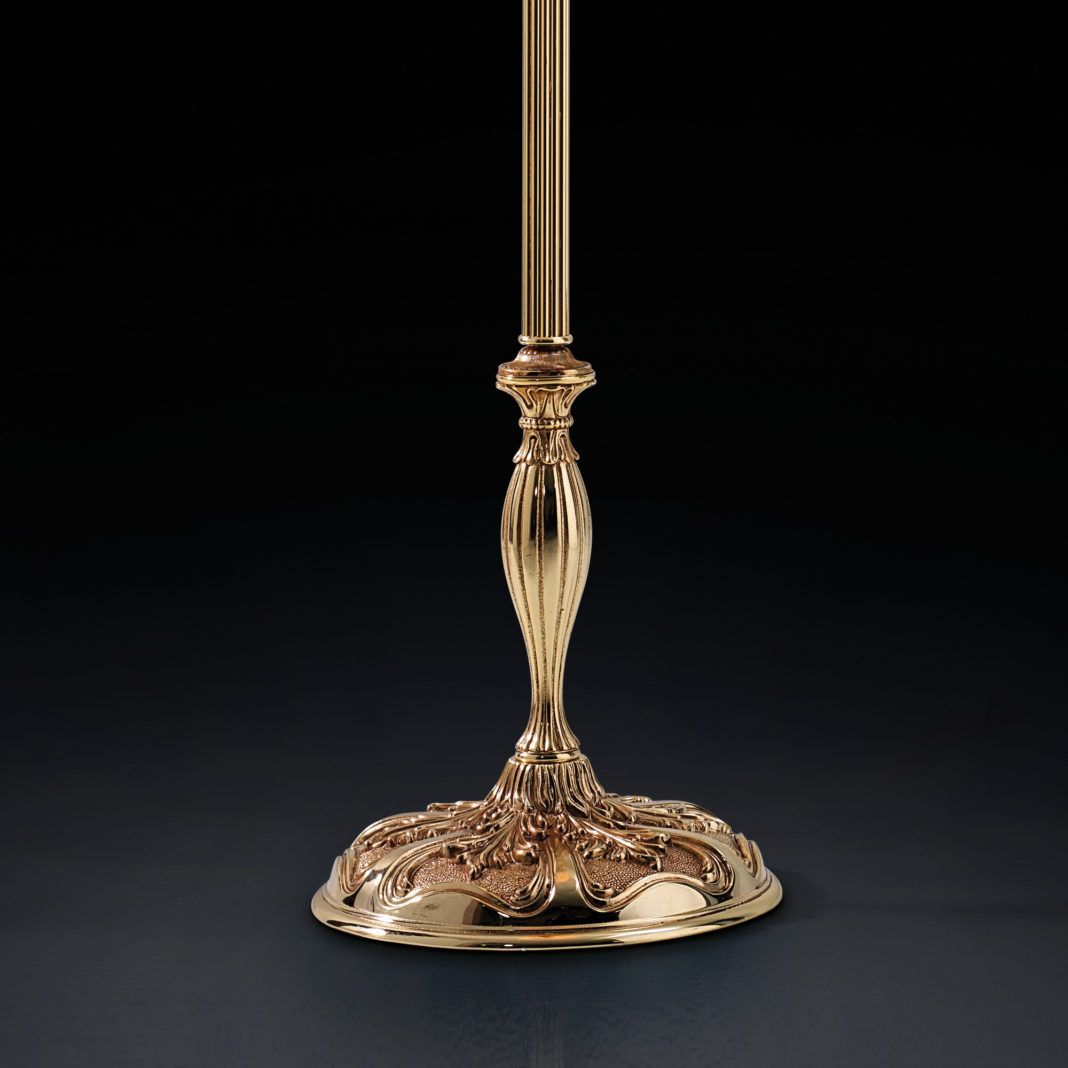 A beautifully detailed ornate brass structure in a French shiny gold finish, with feature pendant detail and a faceted body of amber glass produced in Tuscany. Adorned with an exquisite gold rope tassel. Completed by an ivory silk pleated shade, with luxurious antique gold trim detail. Weight 8.3 kg – which requires 1 x max 60W E27 Bulb. Bulbs are not included. Available with alternative shades, and in various sizes and finishes such as shiny silver, and in topaz, ruby or transparent glass by request. Prices will vary.