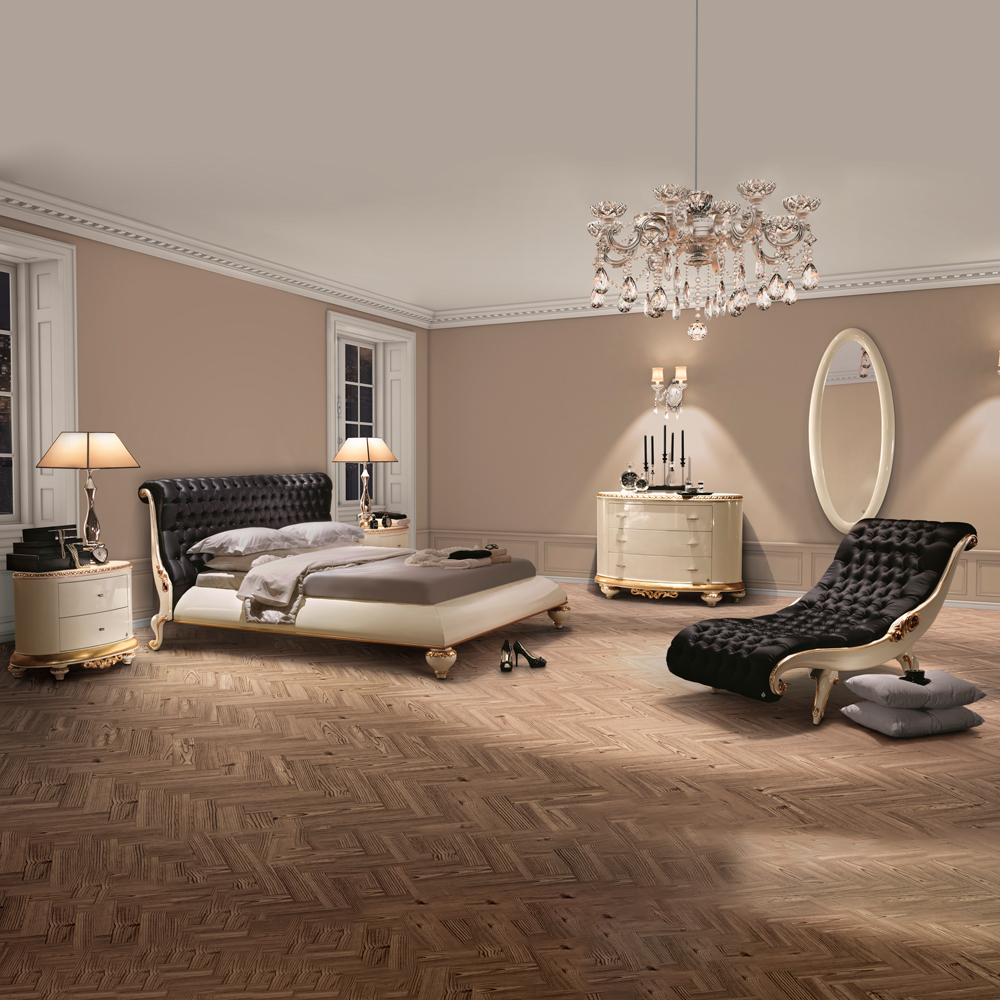 Classic Baroque Upholstered Chaise Longue. Repose and recline in true Hollywood style on this exquisite classically designed Baroque style chaise longue. Adding more than just a touch of luxury to your interior design, this remarkable chaise provides timeless glamour. Beautifully carved from solid wood and finished with a gloss ivory lacquer together with gold leaf scrolled detailing. Superbly button upholstered with a luxury black satin fabric. Place in a bedroom or dressing room for a luxurious statement.