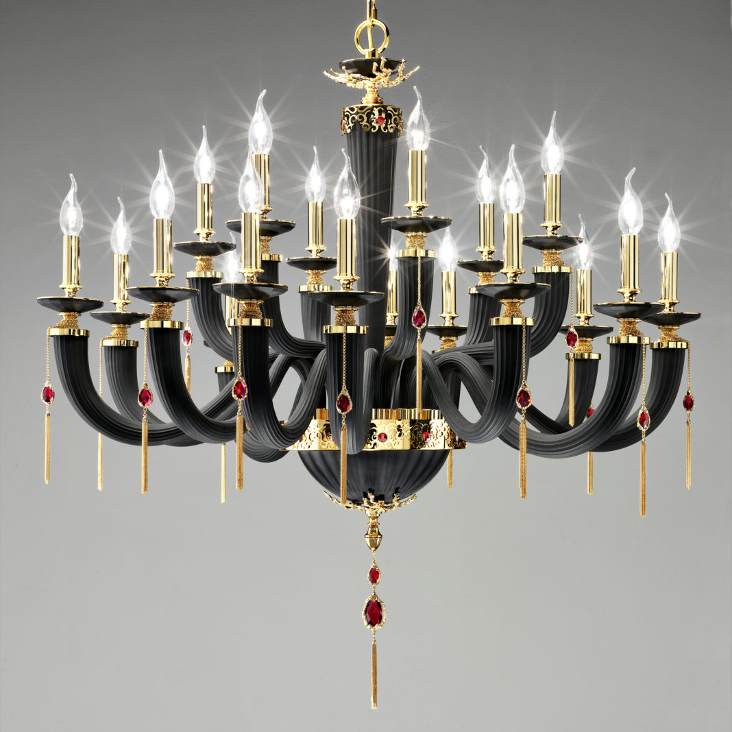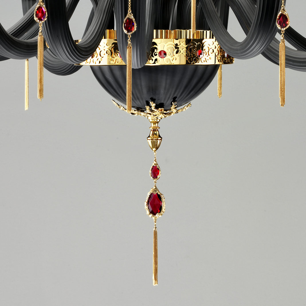 Radiating from an elegant central base and creating a beautiful outline, an ornate brass structure in a polished gold finish is adorned with matt black ribbed glass from the Italian region of Veneto. Matt black faceted bobeches from Tuscany create a striking feature. Completed by handmade decorative chain and tassel elements in a 24K gold finish, embellished with dazzling Swarovski® crystal drops. Weight 33 kg – which requires 18 x max 28W E14 Bulbs. Bulbs are not included. Dimensions are plus hanging chain. Available with shades, in various sizes, a polished silver finish, in a matt red glass colour and with teal blue crystal drops by request. Prices will vary.