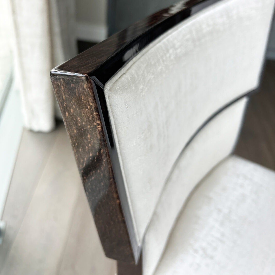 A noble solid beechwood frame in a dark high gloss veneered finish, featuring a generous seat and back. Padded and upholstered with a luxurious rich textured velvet fabric. The flowing curves of the legs extend seamlessly into the back, creating a graceful and welcoming silhouette. Seat height 67 cm. Please note that this is a Counter Stool, but also available in Bar Stool dimensions. Also available as an armchair and dining chair, and in alternative fabrics and wood finishes by request. Prices may vary.
