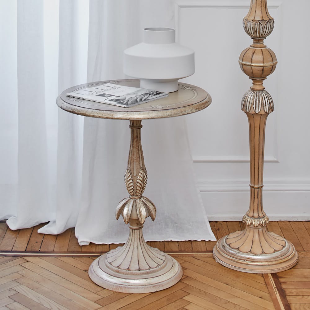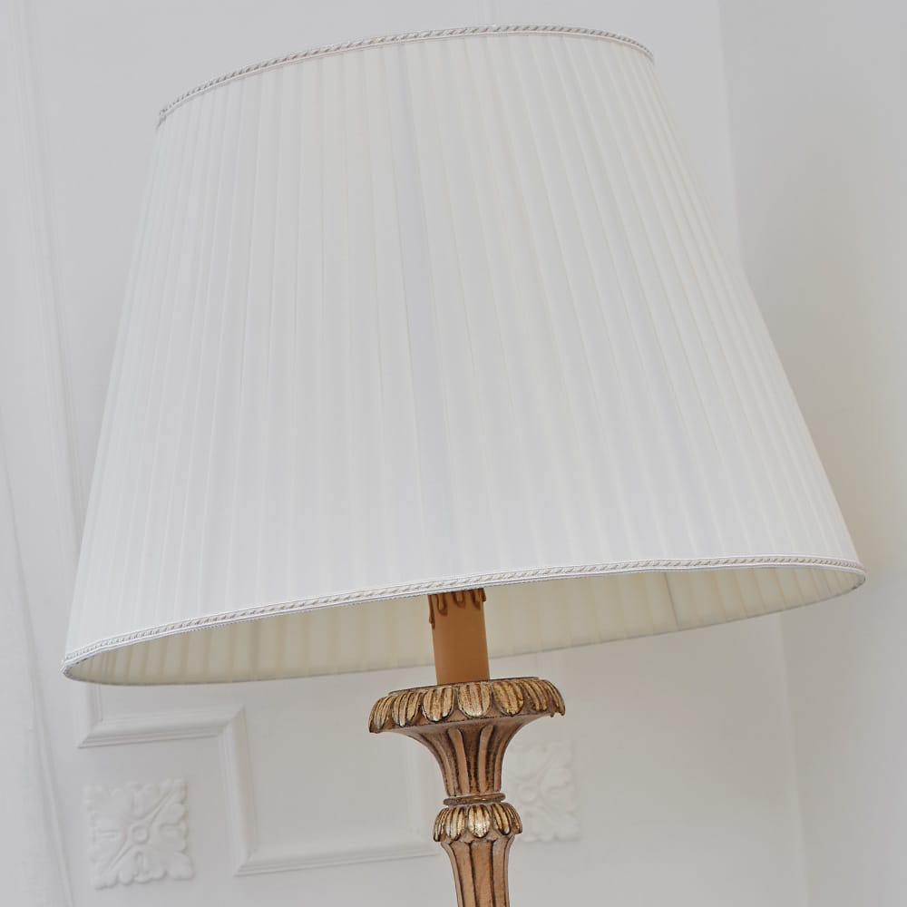 Designed in a classic style making its intricate carvings, curves and painted detail its defining aspect. Beautifully detailed with flowing botanical designs. Shown here in a unique rustic burnt earth painted finish, together with beautiful antiqued hand painted accents of silver and gold. Completed with a fresh pleated ivory shade. Height 185 cm x diameter 65 cm. Uses 1 x E27 max 60 watt bulb, not included. Also available to order in different colours, sizes, finishes and with different shades by request. Prices will vary.