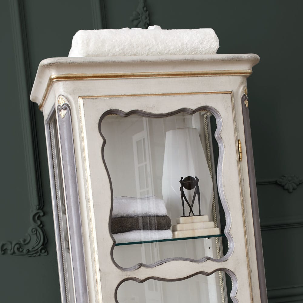 Shown here in an antique grey finish with hand painted silver detailing to the feature carvings. Designed in a classic style making its intricate carved outlines and painted detail its defining aspect. A lockable glass door and internal glass shelves offer the perfect storage solution, making this cabinet an ideal display cabinet, bookshelf or cocktail cabinet. Truly versatile. Height 170 cm x width 55 cm x depth 46 cm. Available to order in different colours, sizes and finishes by request. Prices will vary.