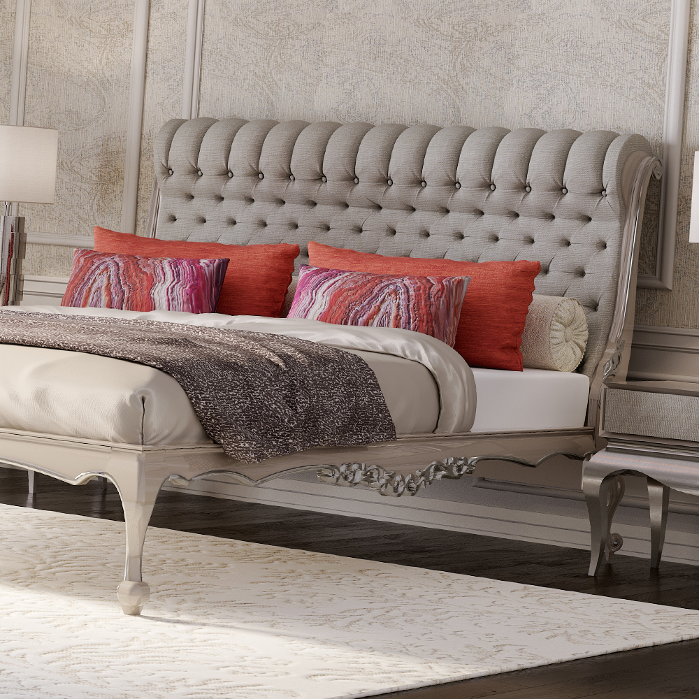 Classic Grey Roll Top Button Upholstered Bed. Timeless elegance along with fine details and finishes provide the focus for this classically styled bed. The roll top headboard is superbly designed and button upholstered in a luxury grey linen fabric. Combining a solid wood bed-frame with delicate cabriole legs, a rich ivory taupe lacquered finish and silver leaf detailing. This exquisite design provides a sophisticated romantic character creating a wonderfully elegant addition to your bedroom interior design. For true versatility this bed is also supplied with a choice of lacquer and finish options together with other fabrics and leathers, including customers own.