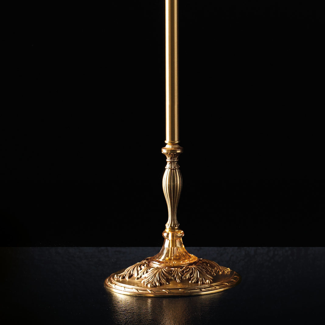 A beautifully detailed ornate brass structure in a French satin gold finish, with faceted glass detail and supporting a hand blown body of dimpled amber glass adorned with an exquisite gold rope tassel. Completed by an octagonal shade in voile and silk fabric in white tones, with a luxurious antique gold trim. Weight 5.2 kg – which requires 1 x max 60W E27 Bulb. Bulbs are not included. Available with alternative shades, and in various sizes and finishes such as French satin silver, and in antique rose, ruby or transparent glass by request. Prices will vary.