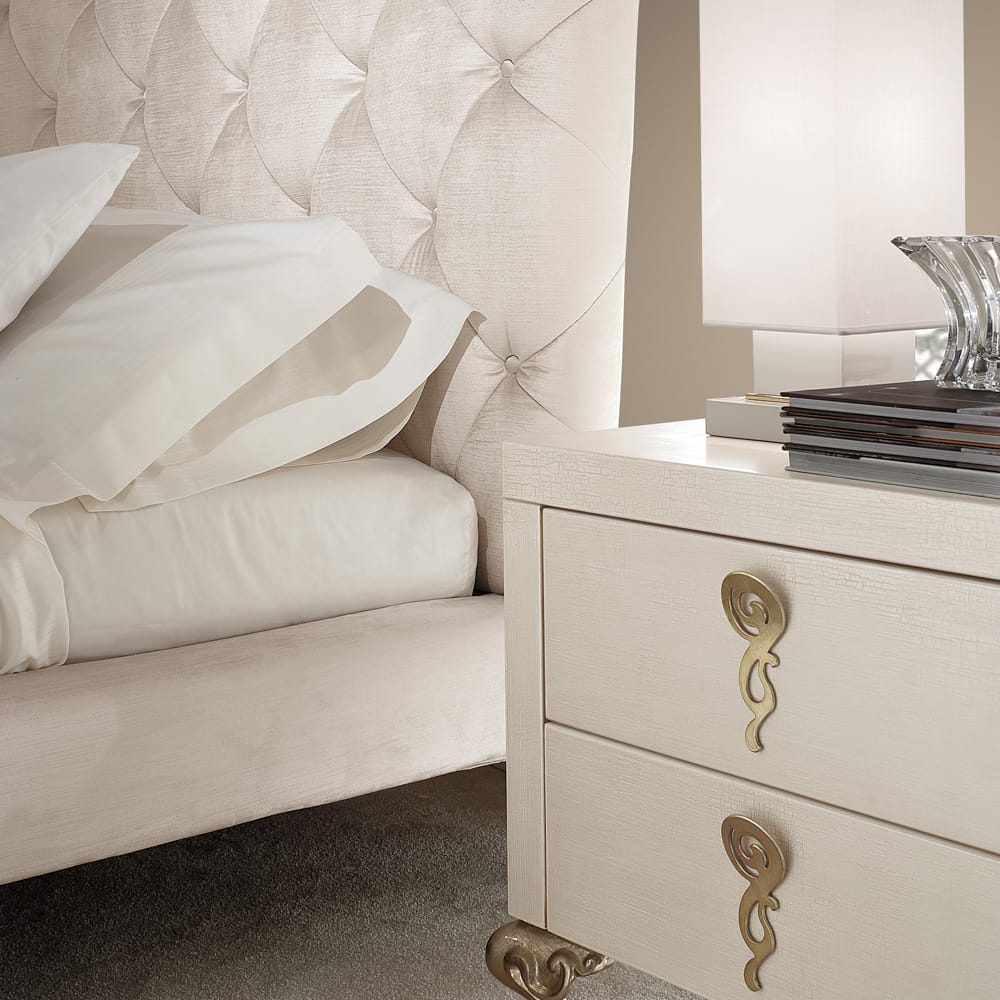 A solid structure beautifully padded, upholstered and button upholstered by Italian master craftsmen to the highest standards in a luxurious soft ivory nubuck leather of the finest quality. Complete with the most refined rococo style aluminium legs in a contrasting striking hand painted champagne leaf finish. Completing this remarkable modern design. In three sizes as standard. To fit a standard mattress size 160 cm x 200 cm, height 144 cm x width 200 cm x length 226 cm – base height 31 cm. To fit a standard mattress size 180 cm x 200 cm, height 144 cm x width 220 cm x length 226 cm – base height 31 cm. And to fit a standard mattress size 200 cm x 200 cm, height 144 cm x width 240 cm x length 226 cm – base height 31 cm. Please note that mattress size is smaller than the bed frame. Headboard, base and slats are included in the price. This exquisite bed is also available also available in an array of frame finishes and upholsteries such as traditional leathers, nubucks, faux leathers and customers own choice of fabric. Bespoke sizes upon request. Prices will vary.