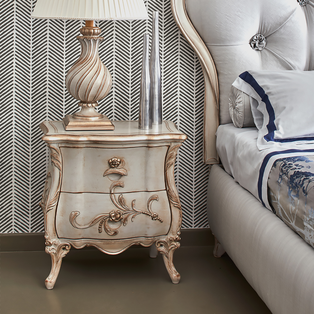 The Classic Italian Designer Bombe Bedside Drawers. This romantic design strikes a perfect balance between a beautiful space and the deepest concept of the ‘home’, offering classic furniture for intimate rooms. Designed to add perfect grace and form to any interior design, together with a practical storage solution.