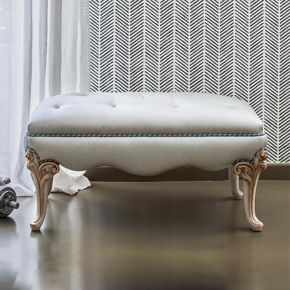 Classic Italian Designer Upholstered Bench. This romantic design strikes a perfect balance between a beautiful space and the deepest concept of the ‘home’, offering classic furniture for intimate rooms. Designed to add perfect grace and form to any interior design.