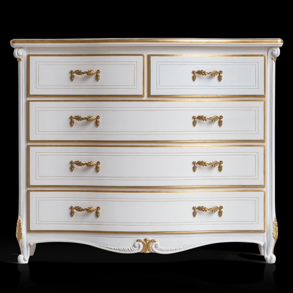 Created by the finest Italian furniture makers to the highest standards this chest of drawers offer superb style and quality. A wooden structure with an Antique White finish with accents of Gold accentuating the exquisite carvings. The drawers feature eight leaf-design handles in a dark coated brass finish, creating a charming focus. This design is beautifully romantic and of exceptional quality. Available in various other finishes and other sizes. Prices will vary. Tempered glass top and marble also available.