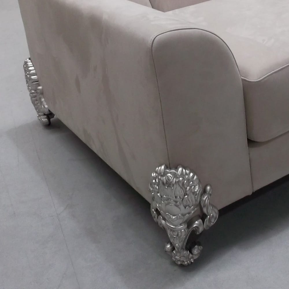 The Classic Luxury Nubuck Leather Designer Armchair, recline and succumb to this sumptuous statement armchair. Combining the ultimate in style and comfort. This high end design uses the best of modern materials together with a superbly elegant classic regal style. Made from solid wood, this gracious well proportioned armchair is fully upholstered and padded to the highest standards using a luxurious Nubuck leather. In contrast, distinct ornate statement feet have a hand crafted silver leaf finish. The back of the chair has an optional central sewn regal motif.