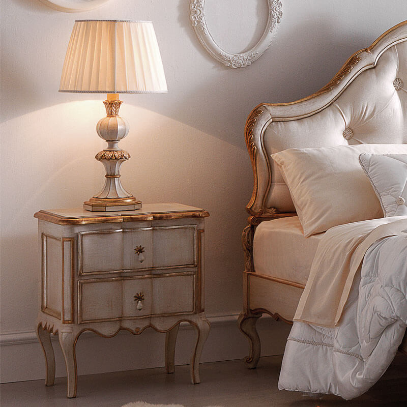 The Classic Reproduction Italian Bedside Cabinet with 2 drawers is a statement piece for any bedroom, shown here in an antiqued ivory finish with hand painted gold to the understated carved detailing with unique star shaped handle fittings with tear drop ceramic pulls. The drawers have an integrated soft close blumotion system for effortless closing and added luxury. Height 70 cm x width 59 cm x depth 40 cm. Alternative frame colours and finishes are available. This cabinet is shown here as part of a bedroom set, also pictured and available.