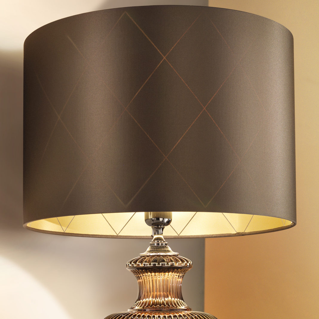 A beautifully detailed ornate brass structure in a black nickel finish, supporting a body of rich brown engraved crystal produced in Tuscany. Completed by a cylinder shade in a luxurious rich mokka diamond fabric. Weight 5 kg – which requires 1 x max 40W E27 Bulb. Bulb not included. Available with alternative shades and finishes, with Viridian Green glass – other glass colours by request. Prices will vary.