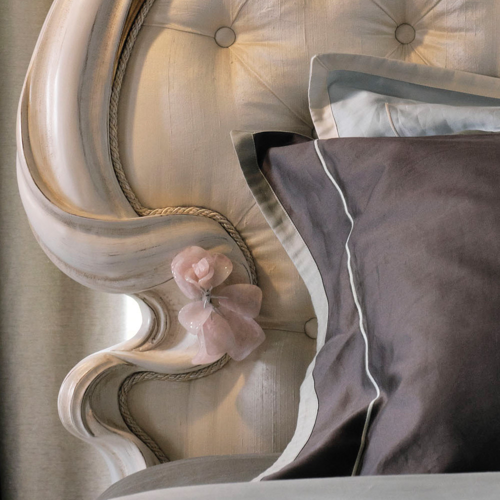Superbly executed by master Italian craftsmen these designs are outstanding in their use of luxury materials and attention to detail. The headboard and base are finished in a luxurious Antique White, with accents of Antique Gold accentuating the exquisite carved detailing. Beautifully detailed with delicate soft pink tone rock crystal roses. The headboard is padded and sumptuously button upholstered in the finest quality rich ivory silk fabric. Completed perfectly with feature piping detail. To fit a 180 cm x 200 cm mattress. Other sizes are available to order with alternative fabrics and leather, including customers own fabric, frame colours and finishes. Prices will vary. Includes headboard, base and slats.
