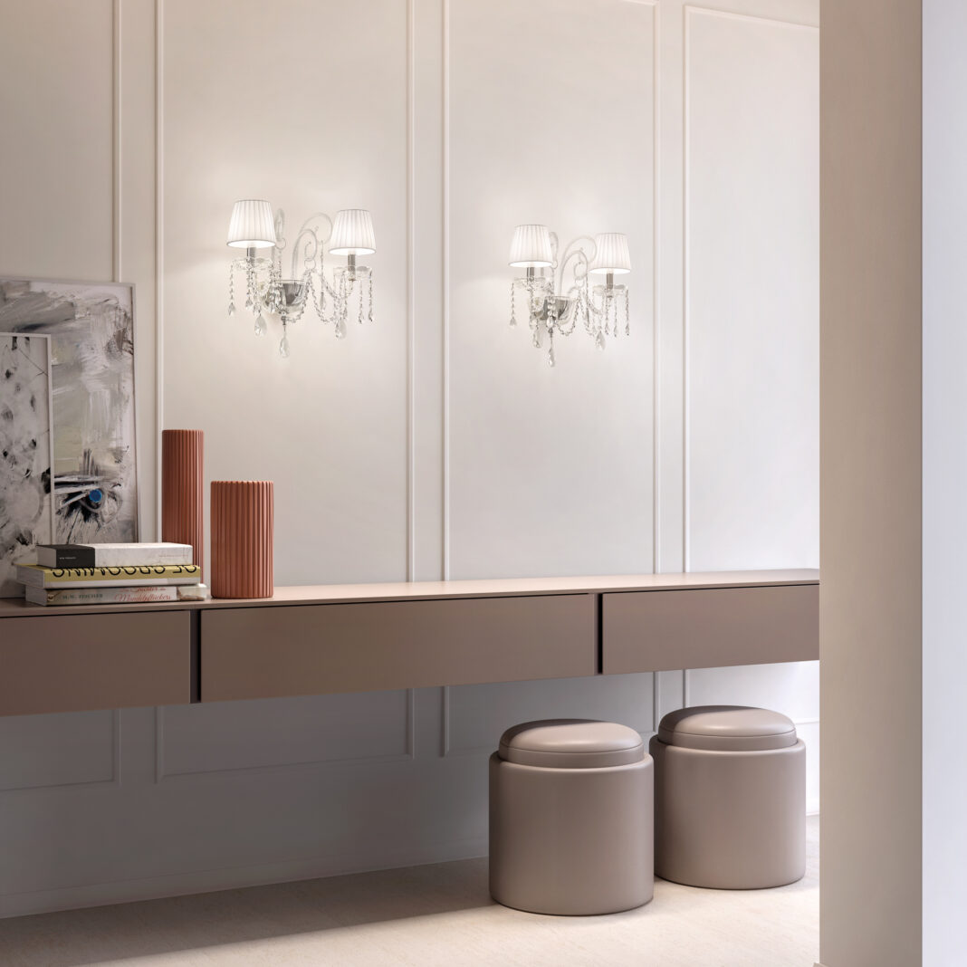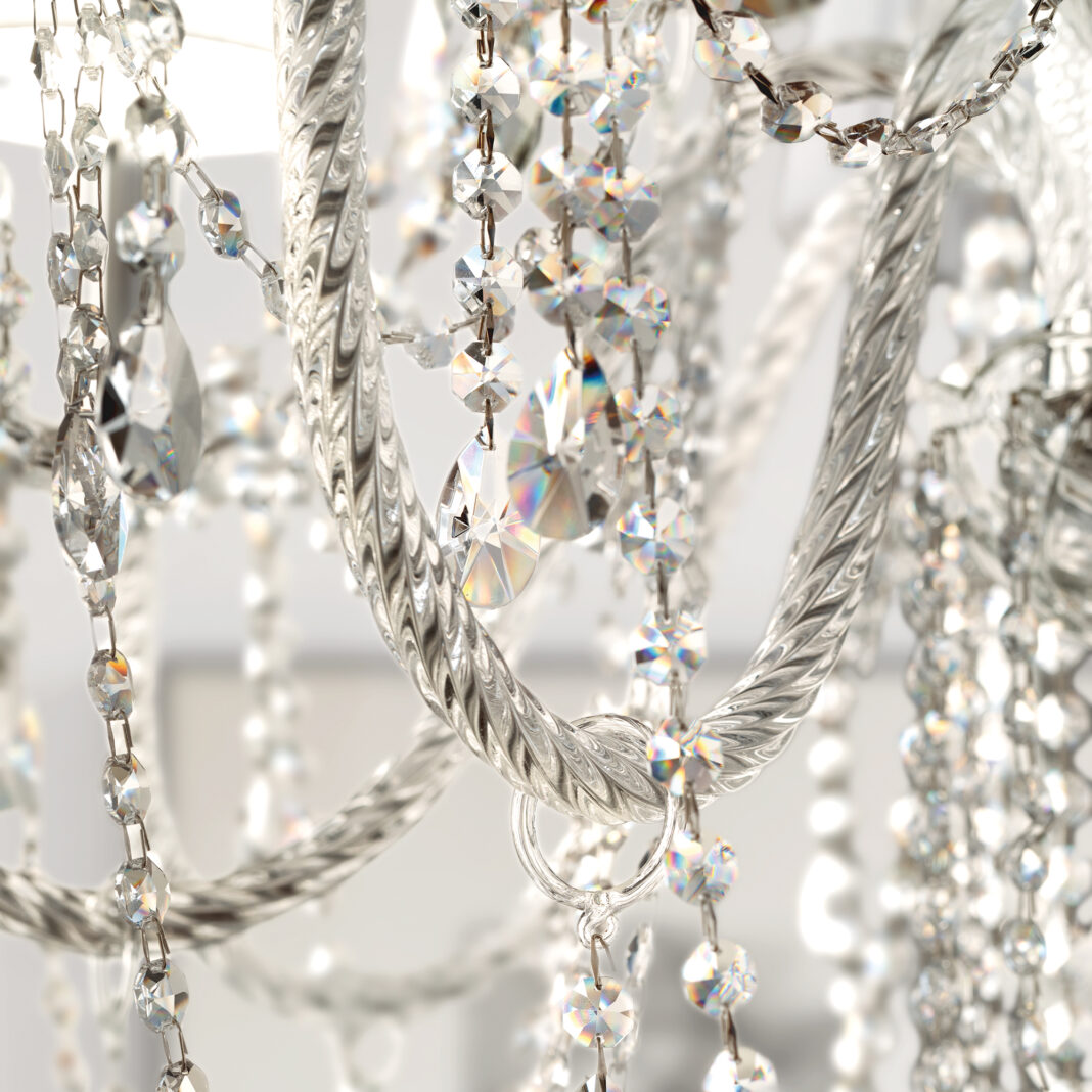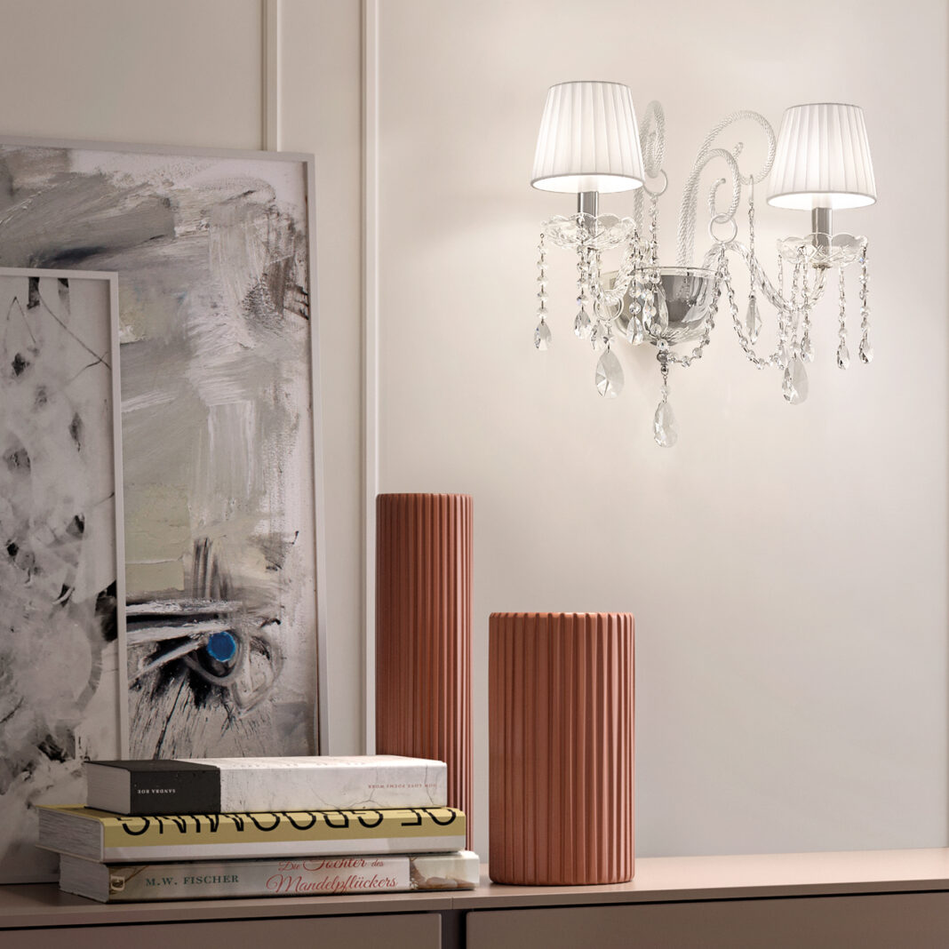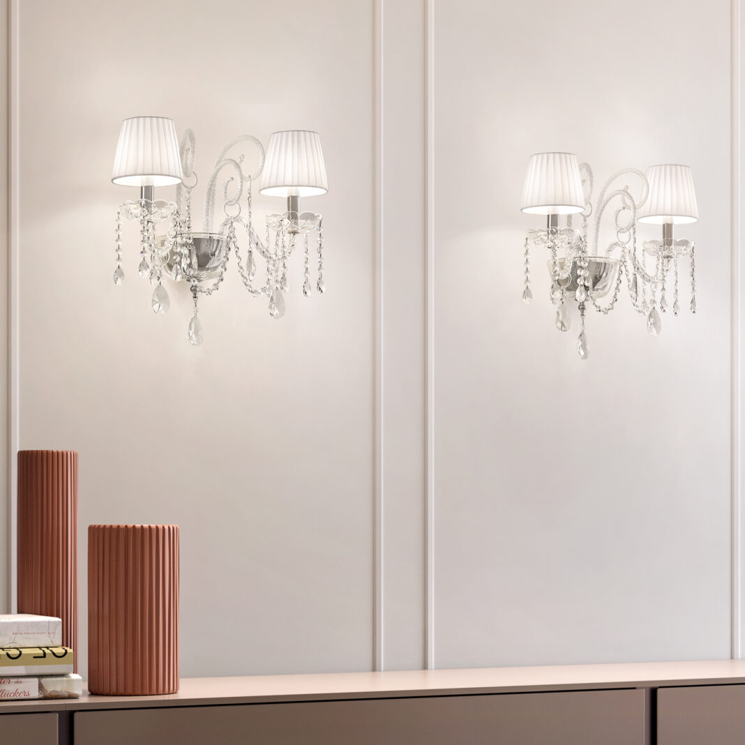 Its frame in a polished chrome finish with blown glass arms, is adorned with dazzling transparent crystals. In either half cut glass, cut crystal or premium crystal. Completed by pleated white silk Pongé shades, light shades known for their ability to diffuse light softly and create a warm, inviting ambiance. Radiating a warm and inviting glow. Weight 2.5 kg. Which requires 2 x E14 x 10 W MAX bulbs. Traditional lighting. Compatible with a TRIAC dimmable system, with dimmable bulbs only. Bulbs not included. Part of a fabulous collection of varying sized Chandeliers – prices will vary.