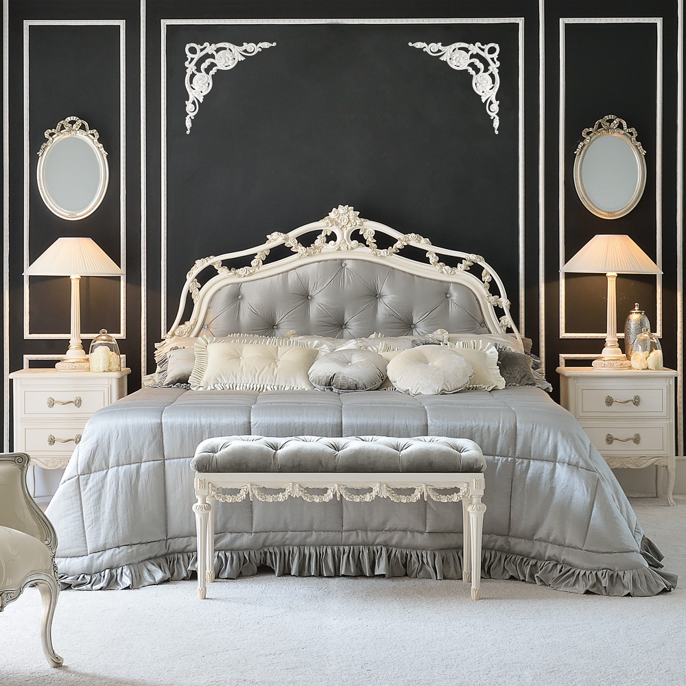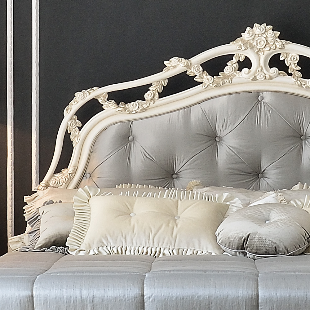 The Classic Style Italian Button Upholstered Bed. Shown here in a luxurious antique ivory and silver painted finish and button upholstered with a high quality silver linen. Available in 2 sizes as standard. To fit mattress 180 cm x 200 cm, overall size height 144 cm x width 187 cm x depth 208 cm and to fit mattress 170 cm x 200 cm, overall size height 144 cm x width 187 cm x depth 208 cm. Other sizes are available to order with alternative fabrics, including customers own fabric and leather, frame colours and finishes and also as a headboard only. Prices will vary.