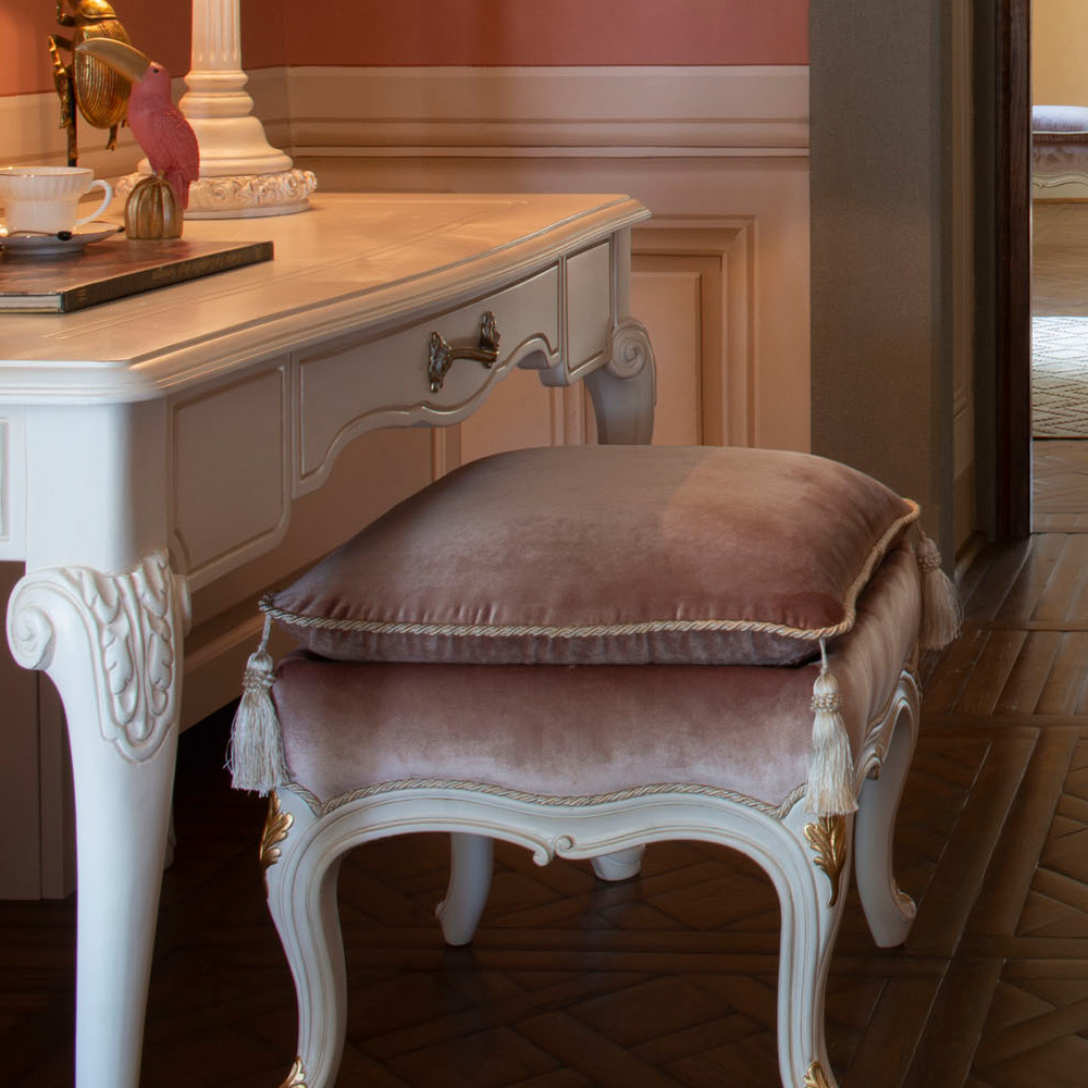 Superbly executed by master Italian craftsmen these designs are outstanding in their use of luxury materials and attention to detail. Shown here in Antique white finishes, with accents of Gold accentuating the exquisite curves and ornate carvings. Padded and sumptuously upholstered in two tones of the finest quality luxury velvets. Completed by luxurious feature piping detail, creating a fabulous focus. Armchair height 90 cm x width 78 cm x depth 79 cm, and footstool height 54 cm x width 52 cm x depth 52 cm. Available in various other fabrics, leathers and finishes. Prices will vary.
