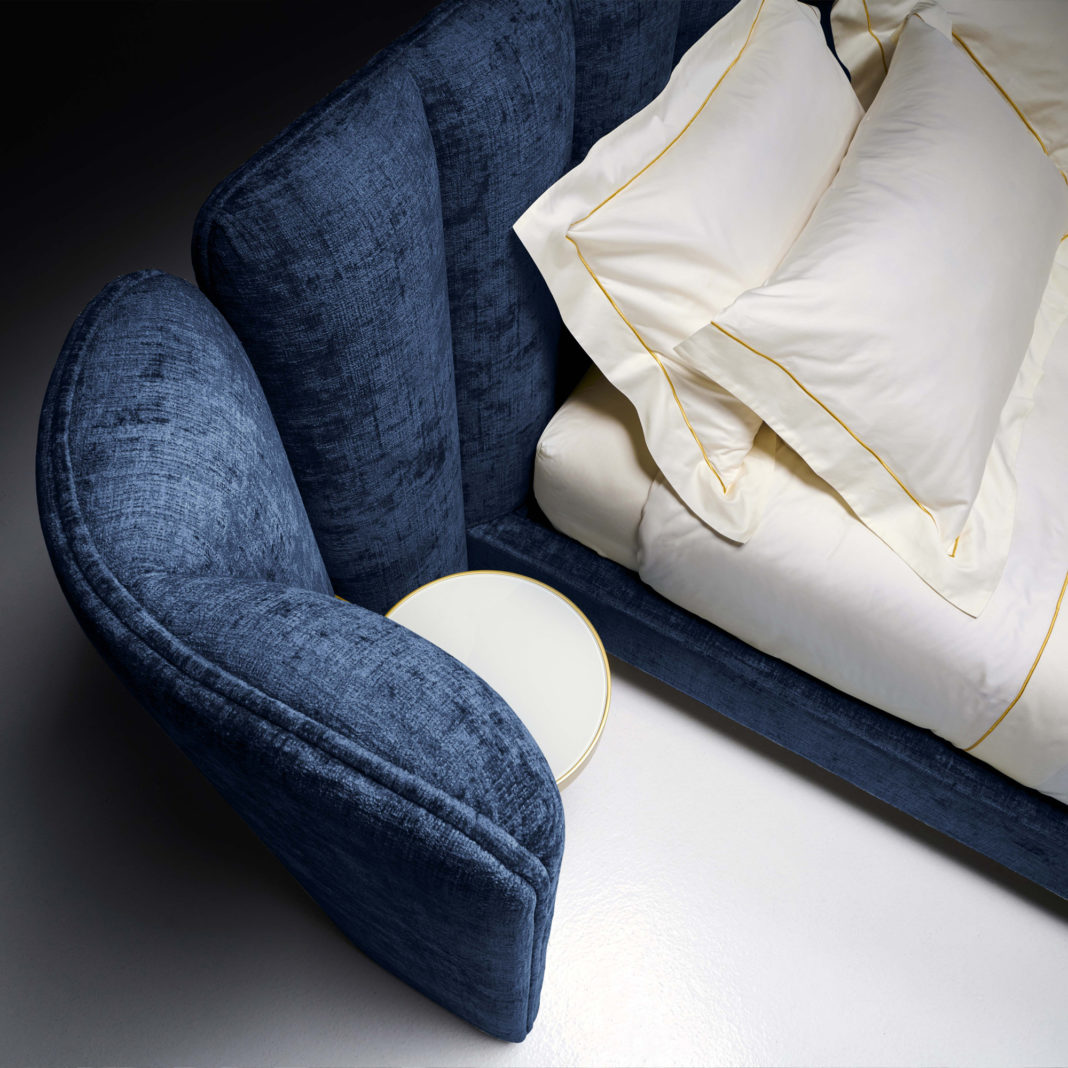 The headboard, curved wings and base are a solid poplar wooden structures. Padded in foam and memory foam in various different densities for the ultimate in luxurious comfort with a wooden slatted base. Shown here upholstered with feature vertical banding to the highest standard in a luxurious rich blue velvet shimmering fabric. Completed by unique metal rod detailing with integrated floating bedside tables with white back-lacquered glass tops, all in a matt gold finish. Available in 2 sizes as standard. To fit a 180 cm x 200 cm mattress at height 109 cm x width 320 cm x length 224 cm, base height 30 cm x width 196 cm. And to fit a 200 cm x 200 cm mattress at height 109 cm x width 337 cm x length 224 cm, base height 30 cm x width 216 cm. Covers are not removable. Alternative metal finishes, upholstery in various leathers and other fabrics including customers own and customised sizes upon request. Prices will vary. Mattress not included.