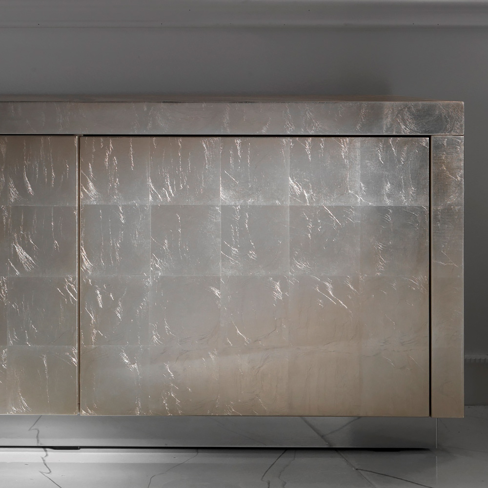 The Contemporary Champagne Silver Leaf Sideboard TV Unit with 3 doors is truly stunning. A touch of opulence for any setting. As comfortable in a dining room, bedroom or study as it is as a welcome in an entrance hallway. The most stylish of storage solutions. Shown here in the most luxurious shimmering champagne leaf finish on a polished steel plinth base. The 3 doors house a push opening mechanism to enhance the fabulous minimal look and feel.