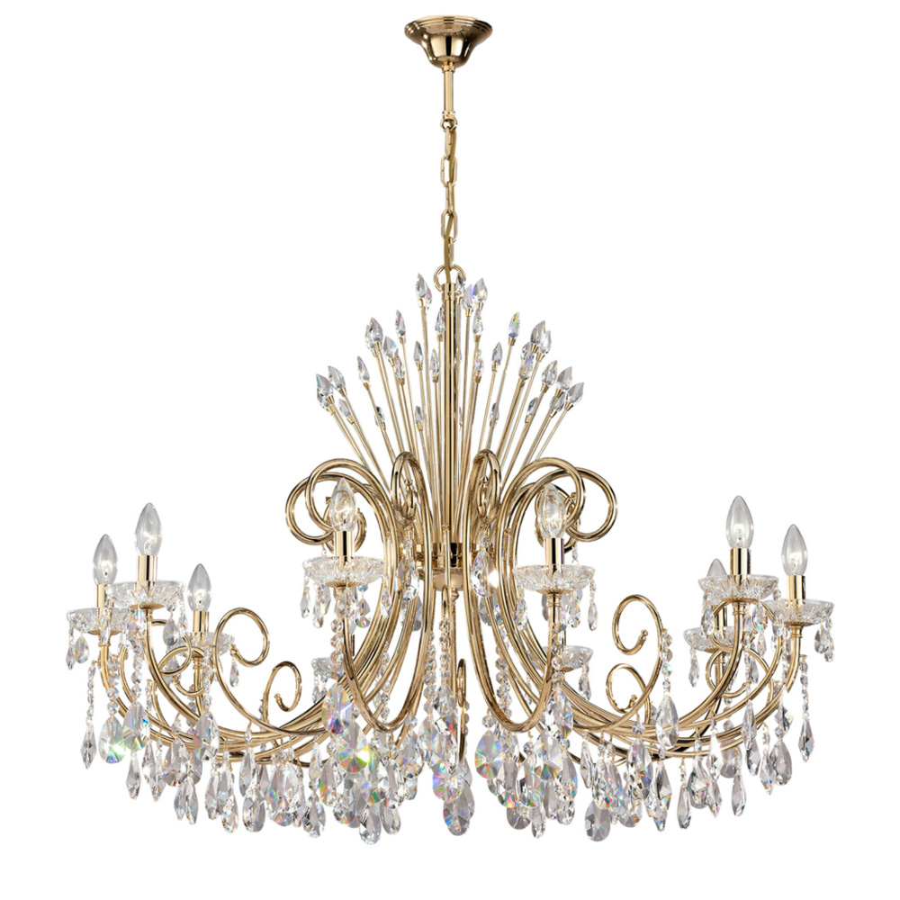 A brass structure in a polished 24 carat gold finish, adorned with a variety of Cut Crystal pendants, bursts and bobeches. Suspended from a ceiling rose. Creating a truly fabulous focus. Hanging height can be customised by request. Also available in other finishes such as a matt, polished and brushed gold, brass, nickel, black nickel and copper. Offering the ultimate in versatility. Prices may vary.