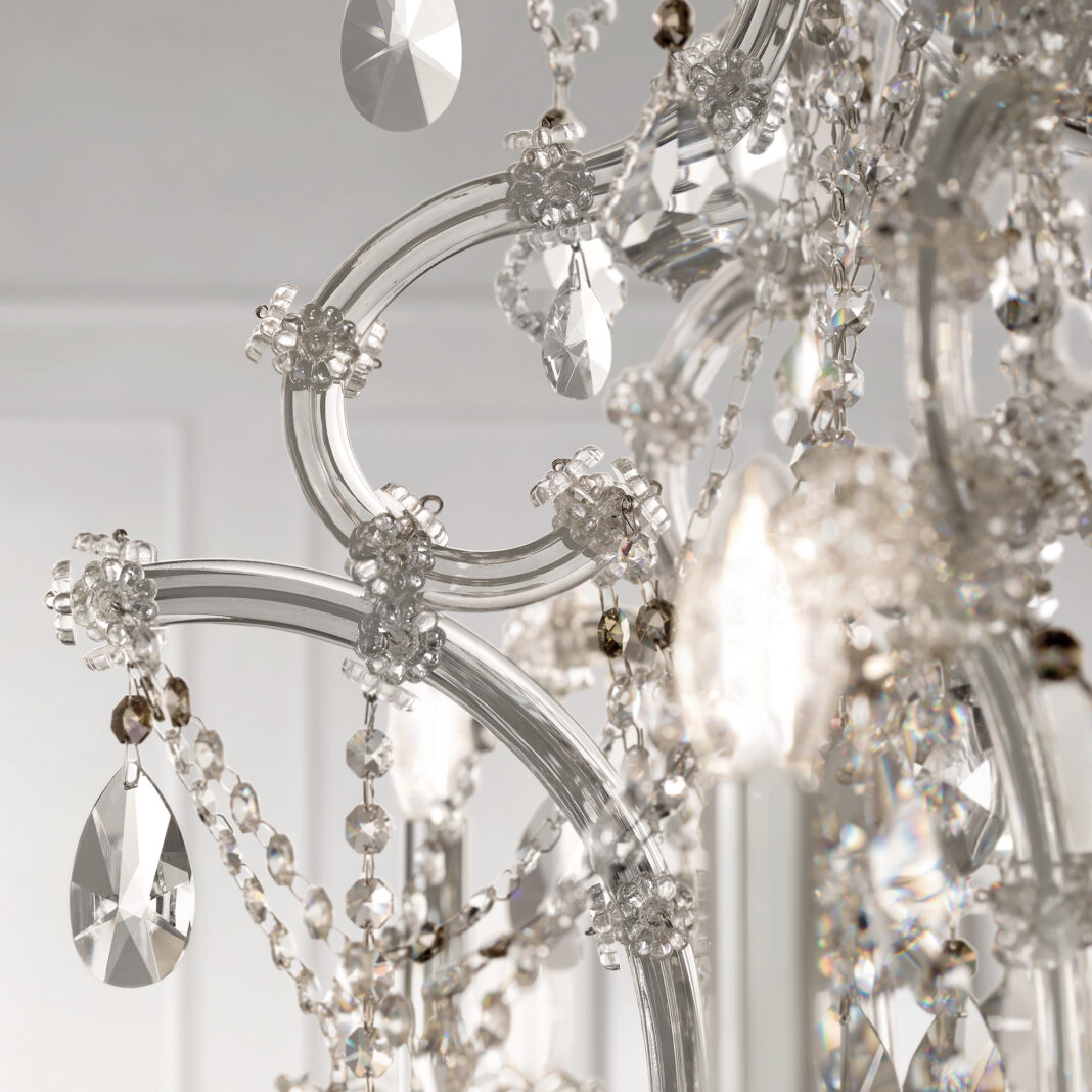 Its galvanised metal frame in a polished chrome finish with arms covered in clear glass, is adorned with dazzling crystals and bobèche. Transparent with a dash of smoked, in either half cut glass, cut crystal or premium crystal. Radiating a warm and inviting glow. Weight 30 kg. Requires 25 x E14 10 W MAX bulbs.