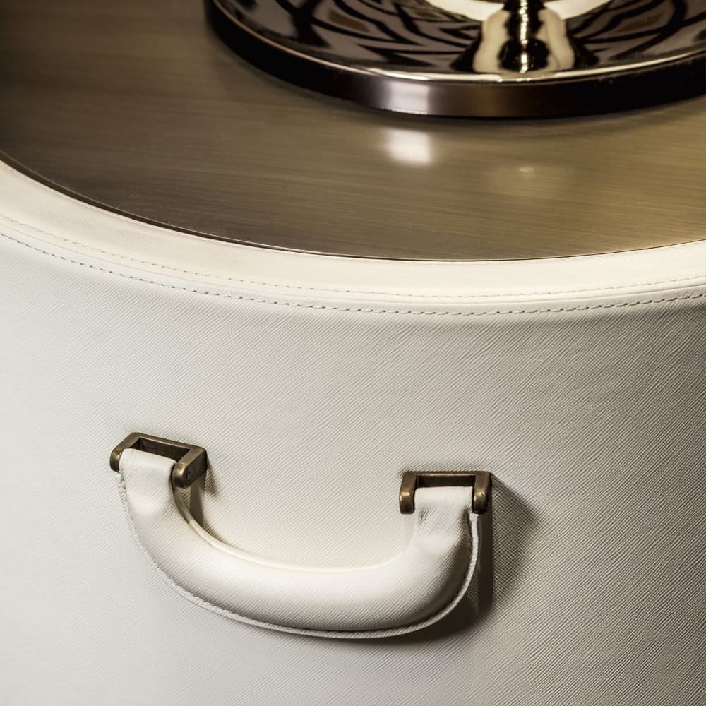An exquisite circular structure with storage space, drawer and handle with defining upholstery and stitch detail in the finest ivory textured Saffiano leather. An inset feature top and statement plinth style base following the sinuous structure and harmonious lines in a stunning brushed bronze finish complete this design. The ultimate attention to detail. Height 54 cm x diameter 52 cm. Weight 28 kg. Available with alternative finishes by request. Prices will vary.