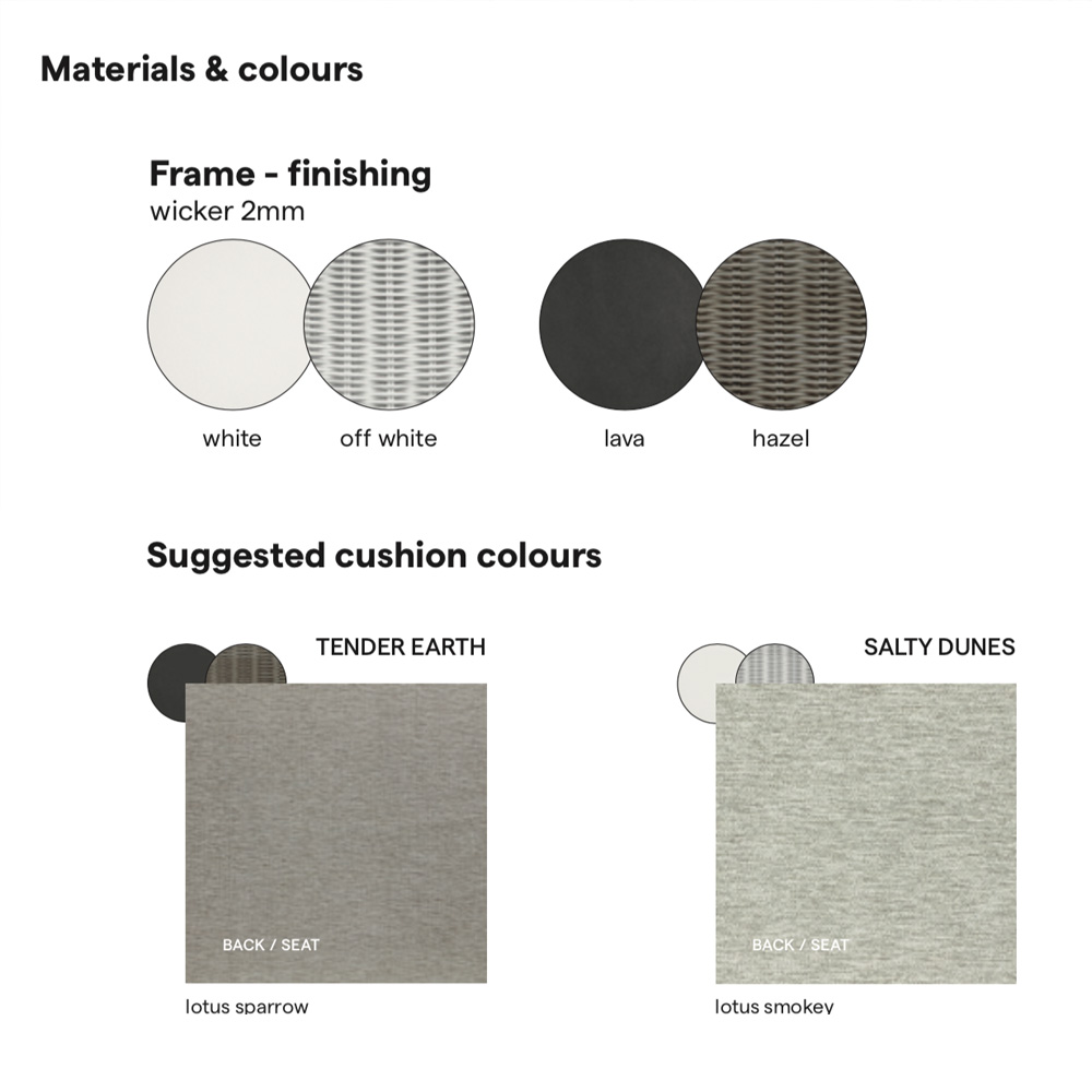 Seat cushion included, various combinations are available, as shown. Scatter cushions are available, but not included in the price.