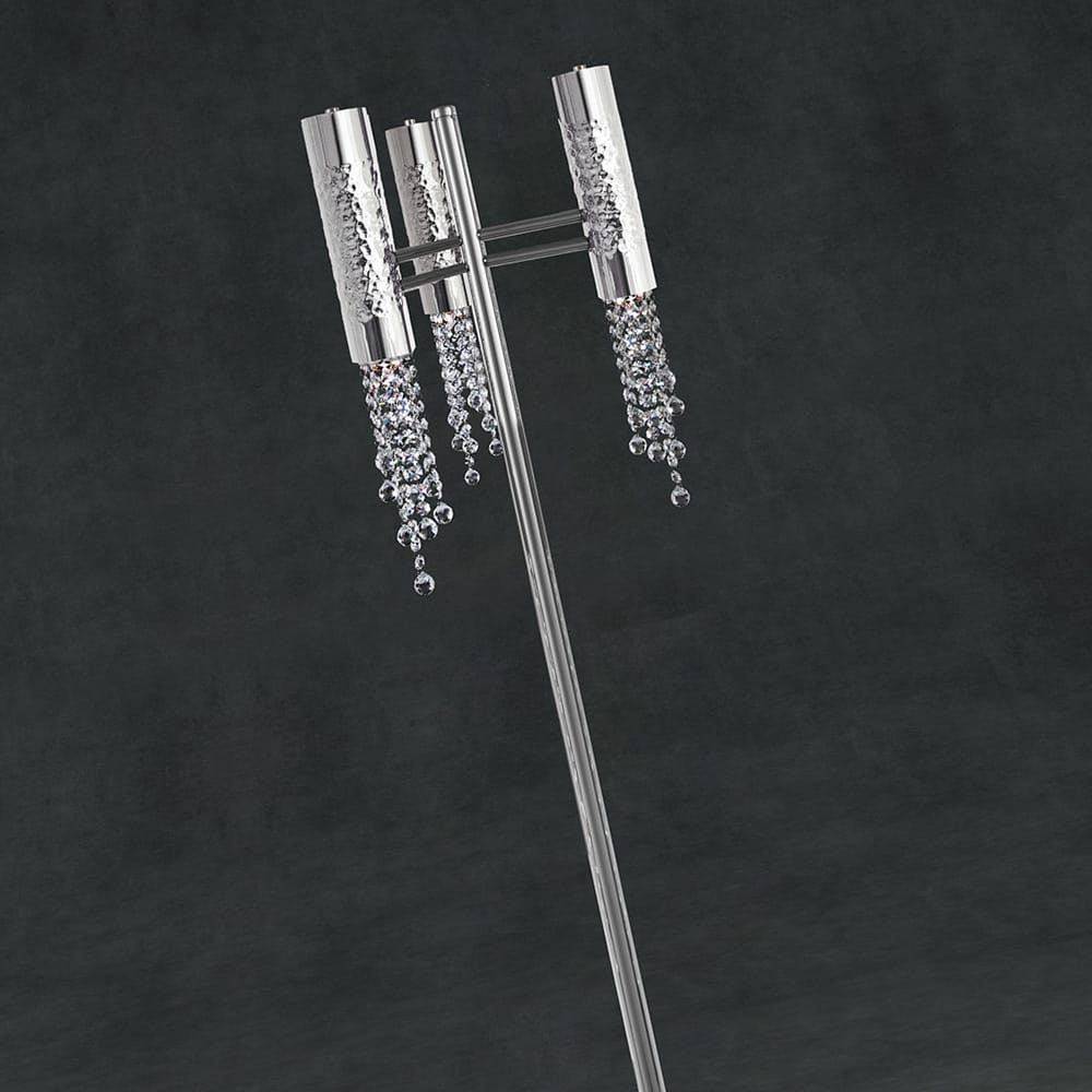 A structure supporting three beautiful forms with a striking hammered effect, housing cascades of sparkling crystal drops. Creating a truly fabulous dazzling focus. Formed in brass and shown here in a polished nickel finish. Height 172 cm x diameter 40 cm, which uses 3 x G9 40W bulbs, which are included. Weight approximately 11.45 kg. Available in other finishes, such as a matt, polished and brushed gold, brass, nickel, black nickel and copper and any matt or high gloss RAL lacquer. Offering the ultimate in versatility. Prices may vary.
