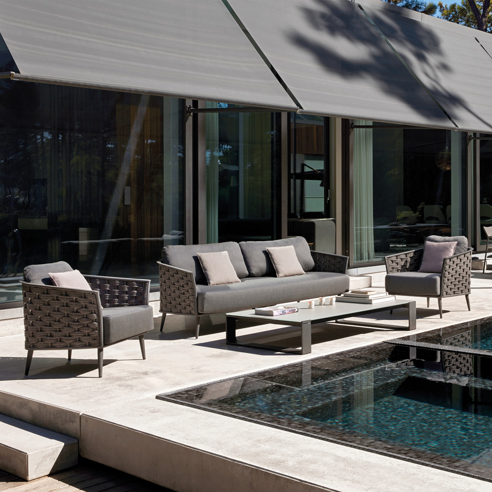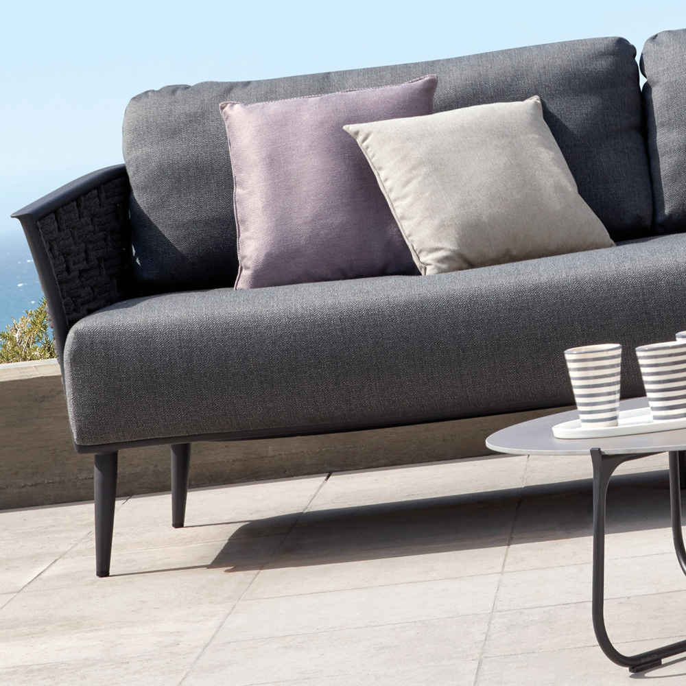 Superbly executed by master craftsmen this design is outstanding in its use of luxury materials and attention to detail. Deep plush seating with elegant curves that depict natural shapes, offering the ultimate in comfort and style. Technical complexity, each piece created by hand. Height 69 cm x width 211 cm x depth 91 cm, arm height 60.5 cm. Weight 32 kg. Shown here in an intriguing mix of a powder coated aluminium frame and contemporary 4.5 cm thick anthracite woven rope. Swimming pool and sea water resistant and repellent. Easy to clean and maintain. Recyclable, GreenGuard certified, REACH certified. The finest of All Weather Fabrics, that have been specifically developed for outdoor use. The fabric is mass-coloured, UV-resistant and does not fade under the influence of light or sunshine. Also available in a white and silver combination. This design is also available in a matching armchair and daybed creating a fabulous collection.