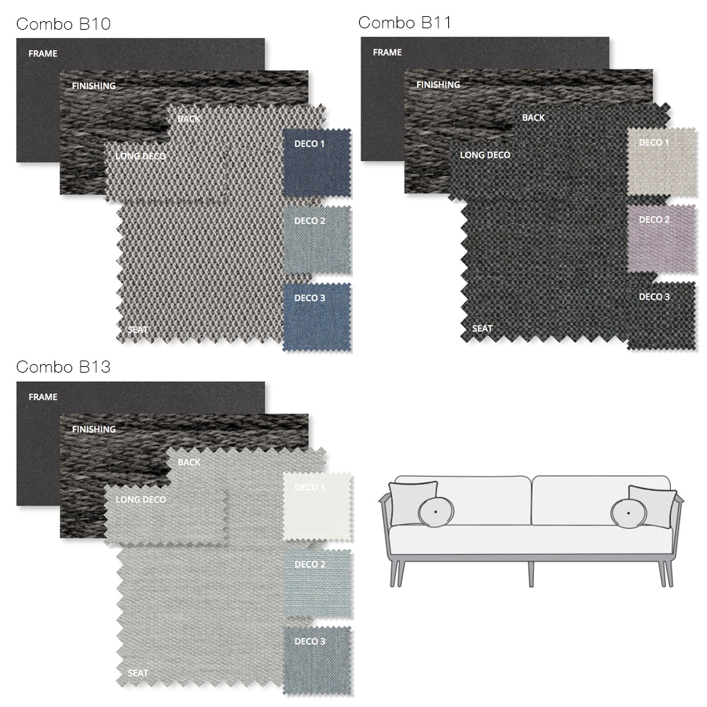 Cushions are included and comprise of a seat cushion, 2 x back cushions, 2 x deco cushions 40 x 40 cm in 2 different fabrics and 2 x deco cushions 30 cm diameter. Various combinations are available, as shown. Protective cover also available by request.