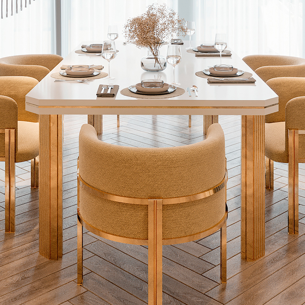 The Contemporary Dining Table and Chairs Set blends timeless sophistication with modern elegance, making it a striking centrepiece in any space. Crafted for those who appreciate sleek design and exceptional craftsmanship, this stunning set elevates both casual gatherings and professional meetings. Its versatile style, accented in fresh white and bright copper tones, adds a refined touch to every occasion.