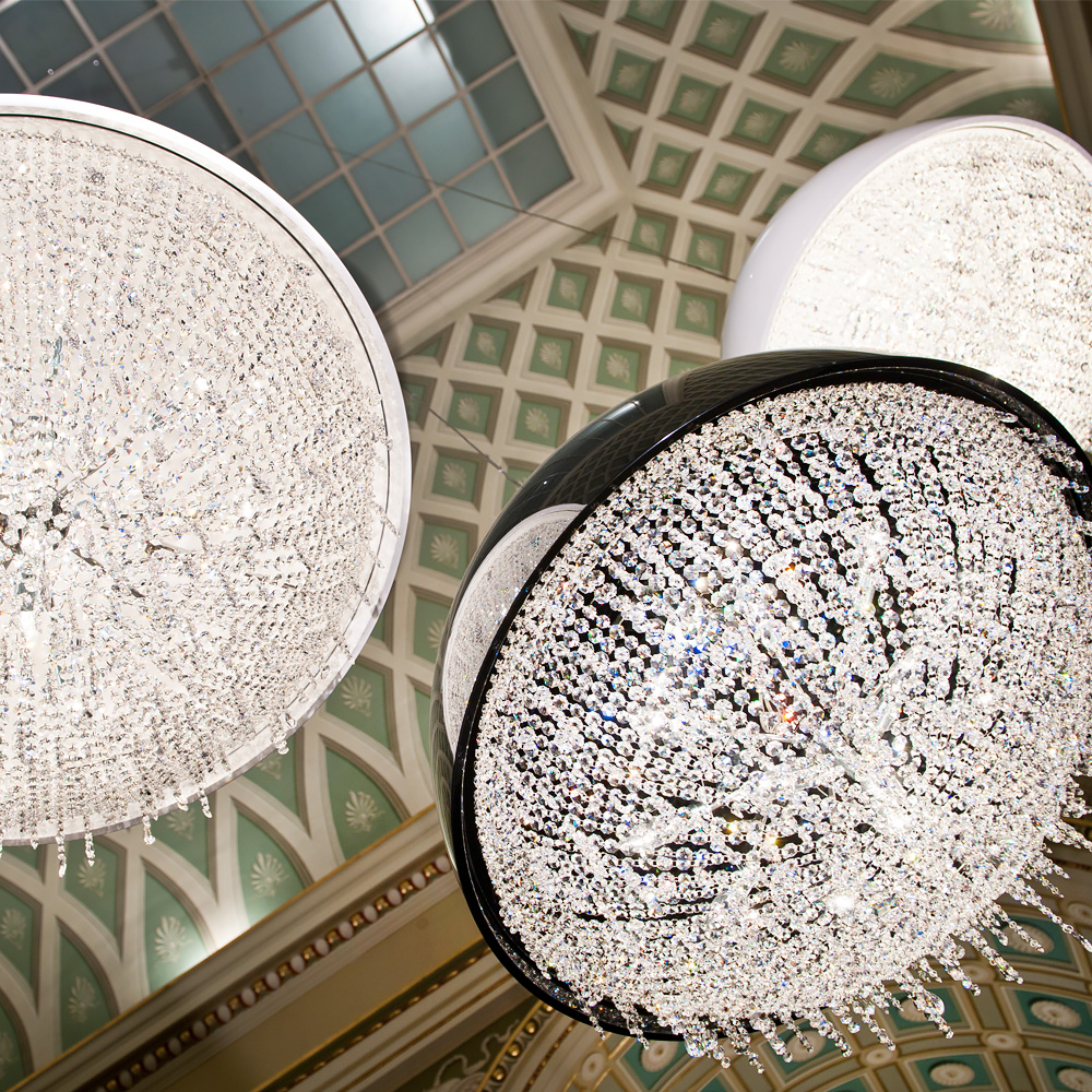 Glittering crystals fall from beneath a sleek lacquered dome. Can also be ordered using crystals, prices vary. Shown here in black as our main image but can be finished in any RAL colour. The intricate arrangement of shimmering crystals shown here in a variety of colours gives the viewer a dazzling visual feast. Use independently or as part of a group installation for an impressive prominent feature.