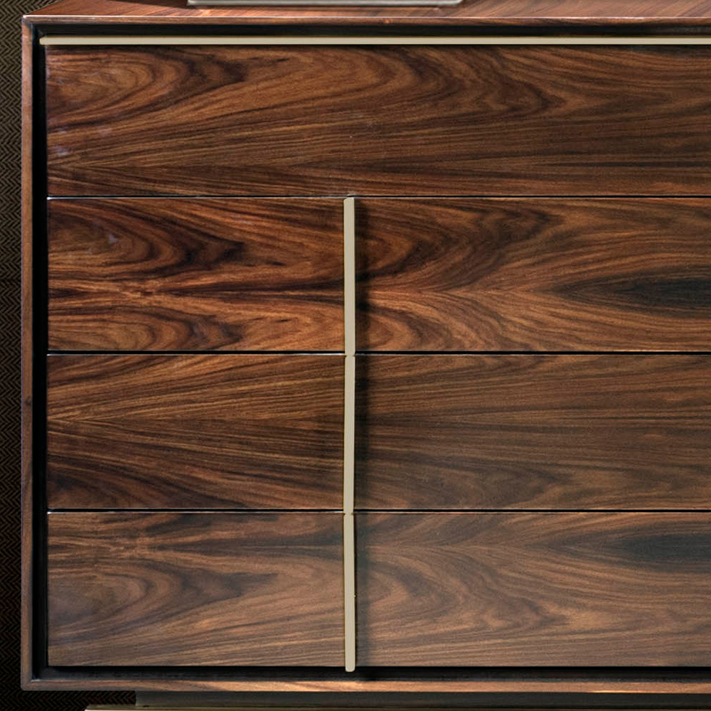 This luxurious dresser features a sumptuous rosewood veneer and brass finish. Exquisitely complemented by eight drawers, allowing for a generous amount of storage space. Available in a variety of finishes. Prices will vary.