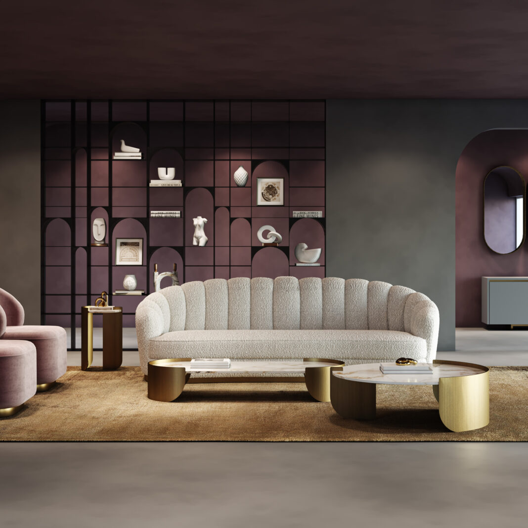 Showcasing exceptional craftsmanship, curved metal bases with 3 mm top steel support guarantee stability and durability, sanded, primed and finished in a lustrous brushed brass finish. Supporting varying shapes of 6mm beautifully veined Gold Calacatta faux marble tops. Also available in alternative metal finishes, and top in tempered glass, stone and various marbles by request. Prices will vary.