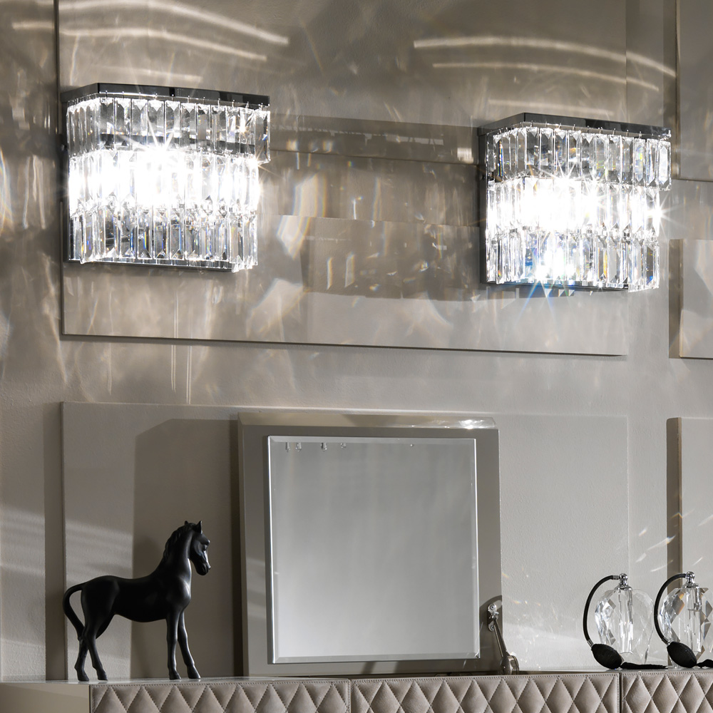 The Contemporary Glass Pendant Chrome Designer Italian Wall Light adds sophisticated ambience to any interior. Use as a striking addition in any bedroom setting, create a fabulous focus behind a sofa, divine in a dining room or provide the most sparkly of welcomes in any hallway. Above all offering boundless style and giving a luxurious atmosphere to any setting. Beautiful in pairs as shown here, truly versatile. A modern bright chrome structure, together with and supporting three tiers of dazzling bevelled glass pendants.