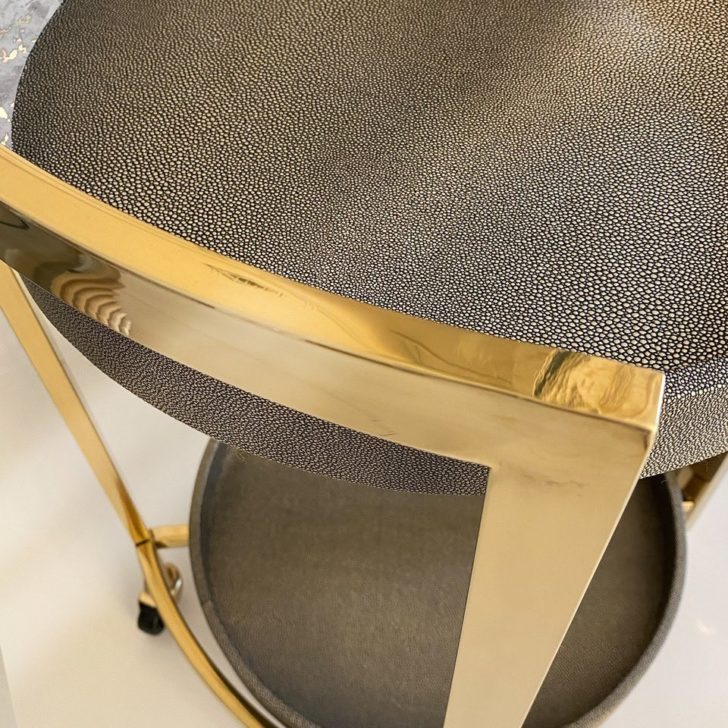 The Contemporary Gold Finish Trolley With Faux Leather, this modern design features a gold finish metal frame together with contrasting contemporary faux leather shelves. Combines castor wheels for ease of movement. Just perfect for storing or serving your favourite liquors, wines and aperitifs.