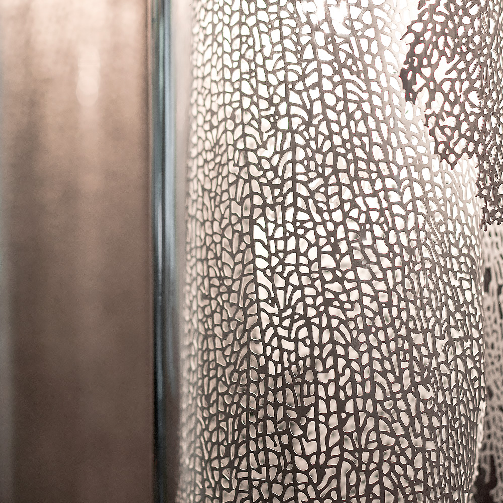 Contemporary High End Pendant Light. This fabulous eye-catching design is intelligent and subtle. Encased in the highest quality Borosilicate glass is a delicate silver metal imprint of a coral leaf. Hidden inside is a single bulb, projecting a dynamic shadow making this unique design outstanding in its simplicity. Borosilicate glass is known for its exceptional quality and durability taking this light to the next level of superiority.