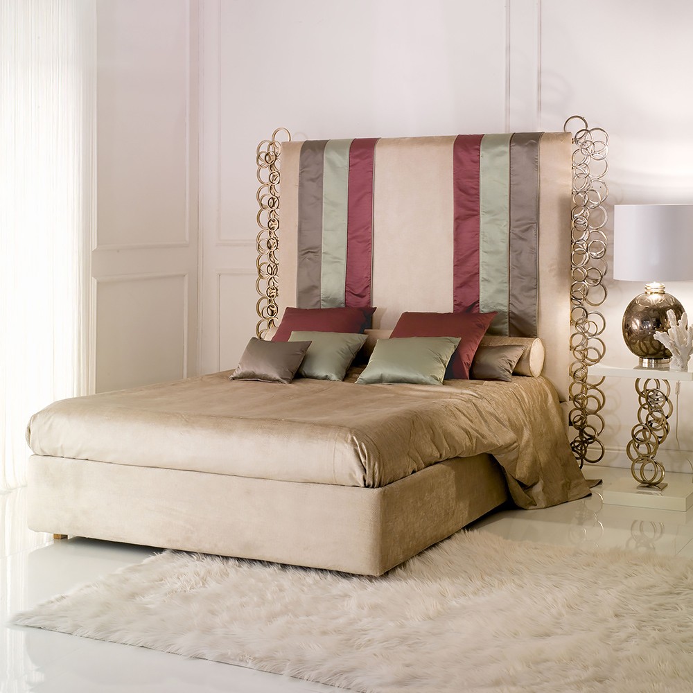 This luxurious headboard provides an elegant contemporary design. Combining beautifully upholstery and a unique lateral arrangement of hand brushed, wrought iron chromed rings, also featuring two striped luxury silk panels, which can be made in alternative colours and fabrics. Altogether creating an exclusive atmosphere.